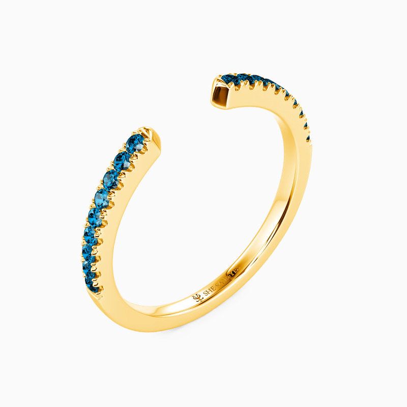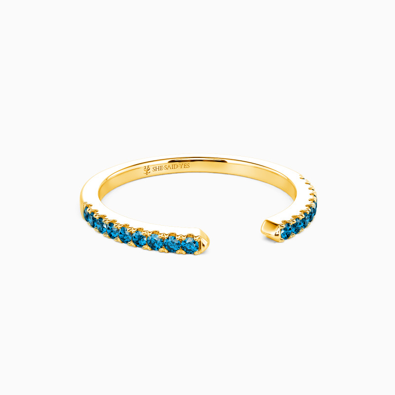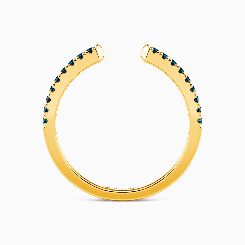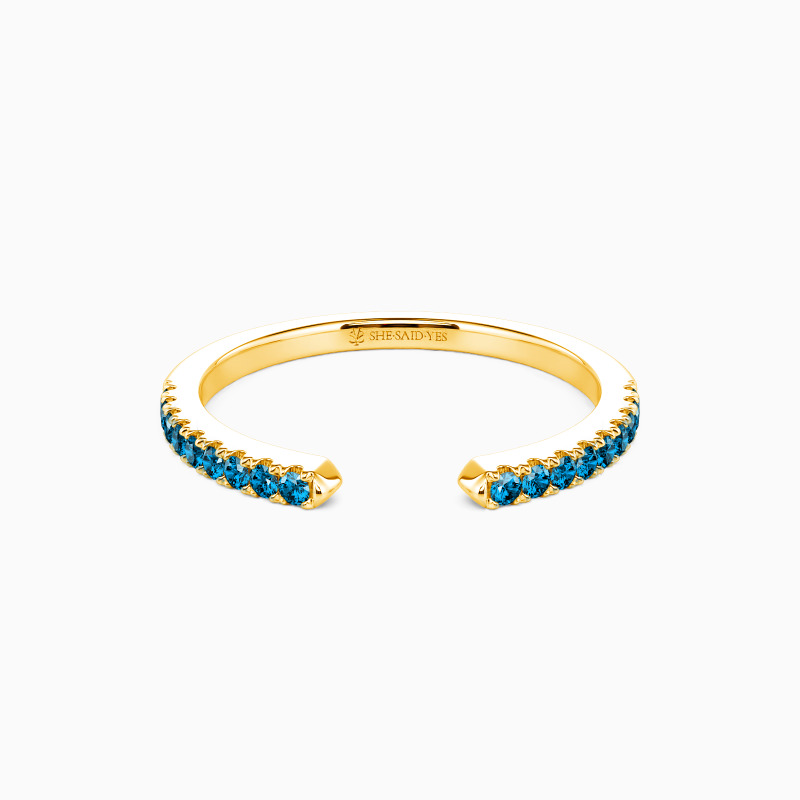 This open wedding band balances elegance and versatility. Scalloped pavé gems adorn one half of the band, lending a delicate sparkle that catches the eye. The open design allows for flexibility in wear, making it a perfect match for any engagement ring. It's a stylish testament to love, as unique and beautiful as the gems it holds.