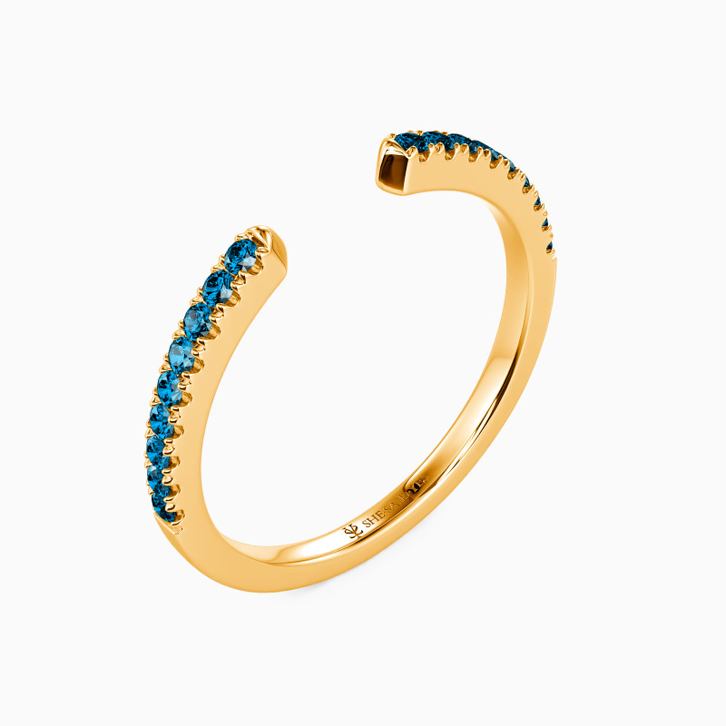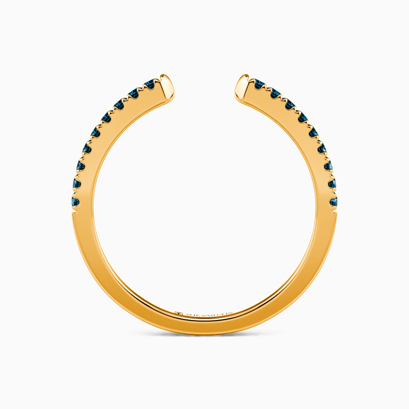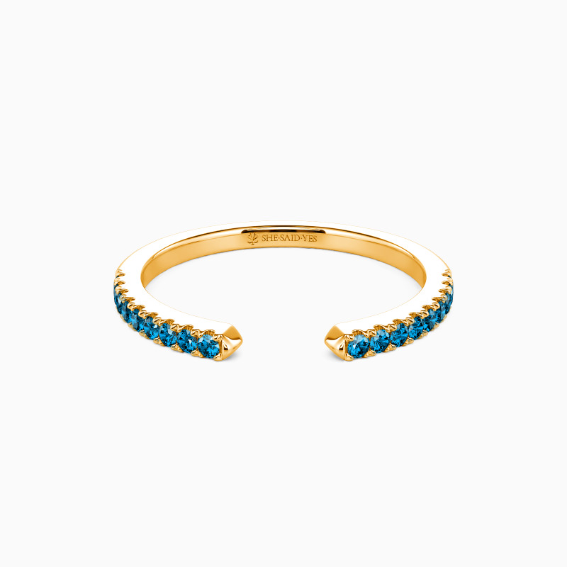 This open wedding band balances elegance and versatility. Scalloped pavé gems adorn one half of the band, lending a delicate sparkle that catches the eye. The open design allows for flexibility in wear, making it a perfect match for any engagement ring. It's a stylish testament to love, as unique and beautiful as the gems it holds.