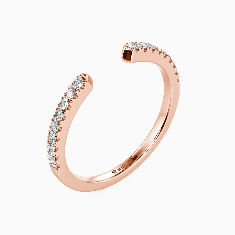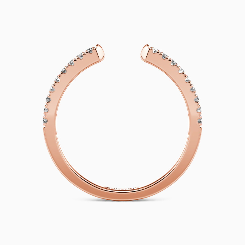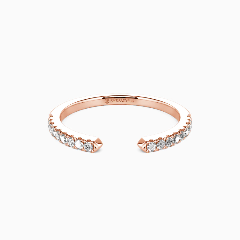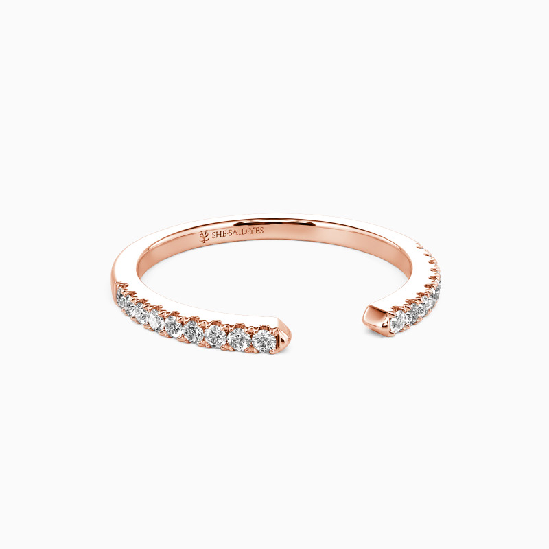 This open wedding band balances elegance and versatility. Scalloped pavé gems adorn one half of the band, lending a delicate sparkle that catches the eye. The open design allows for flexibility in wear, making it a perfect match for any engagement ring. It's a stylish testament to love, as unique and beautiful as the gems it holds.