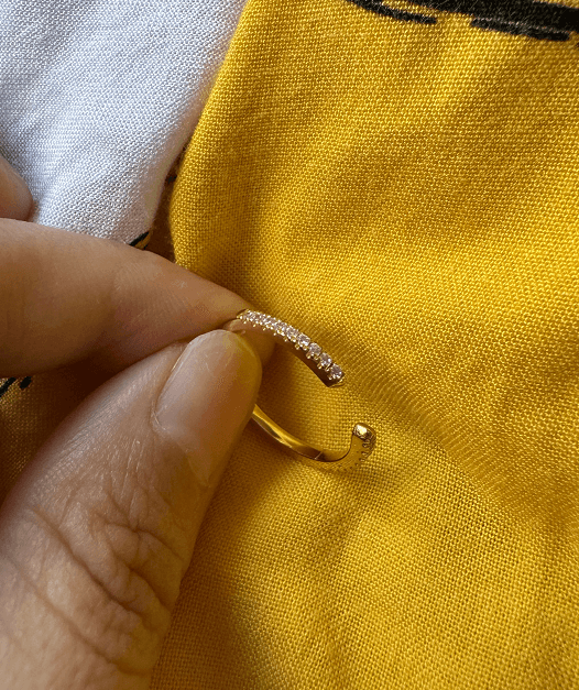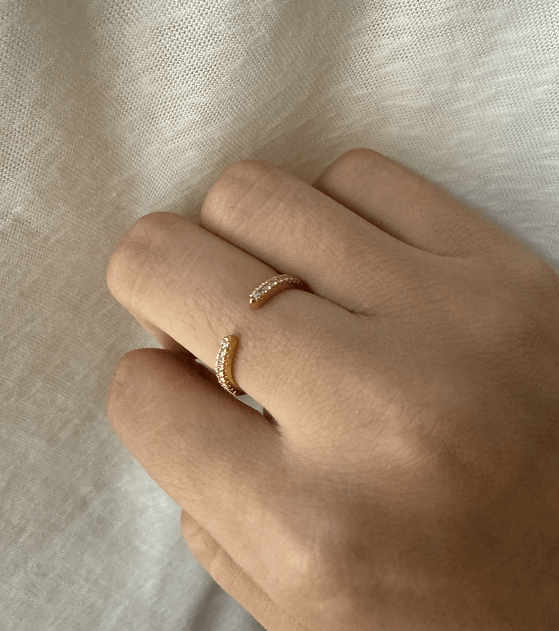 This open wedding band balances elegance and versatility. Scalloped pavé gems adorn one half of the band, lending a delicate sparkle that catches the eye. The open design allows for flexibility in wear, making it a perfect match for any engagement ring. It's a stylish testament to love, as unique and beautiful as the gems it holds.