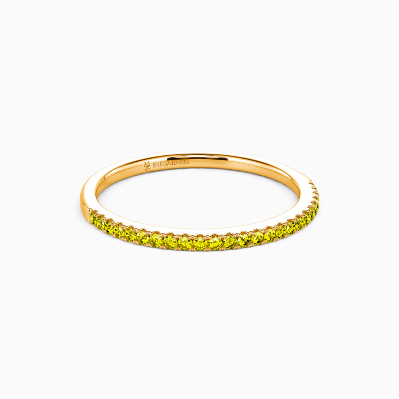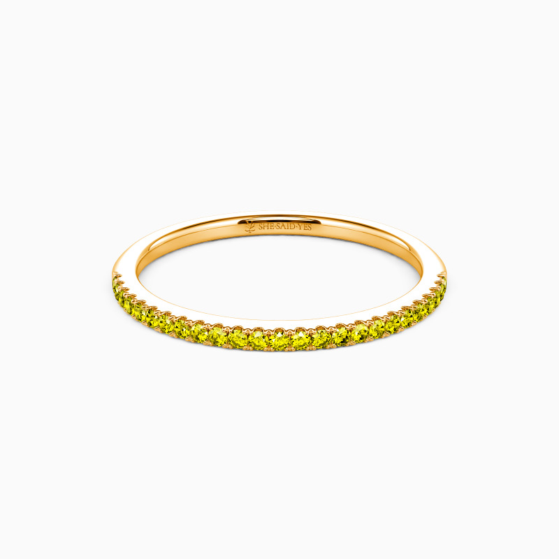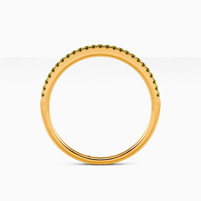 A timeless wedding band for every beautiful bride-to-be. This classic half-eternity wedding ring features a row of round gems along the polished shank. Blending a minimalist design with shiny radiance, it fits perfectly in any style of your attire.
