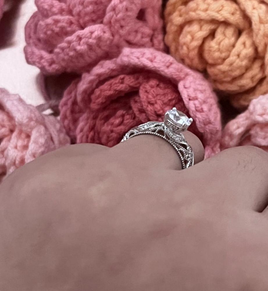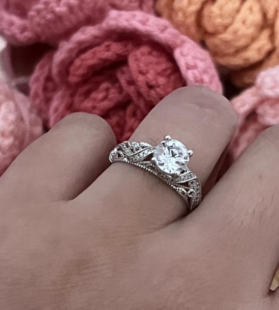 Sophisticated and vintage. This alluring engagement ring owns a round-cut center stone in four prongs that shine with radiance. Exquisite in shank design, it features a twisted ribbon paved with shimmering stones running throughout the swirling patterns on the whole shank. A piece full of craftsmanship brings out the charming glamour for your darling on a special day.