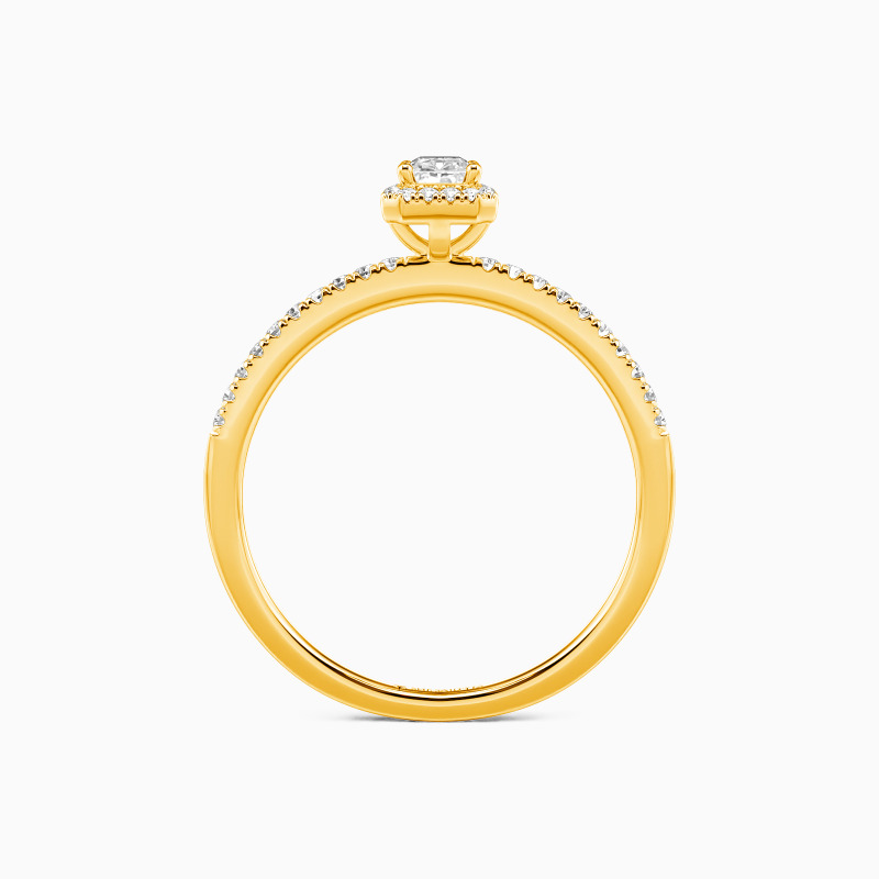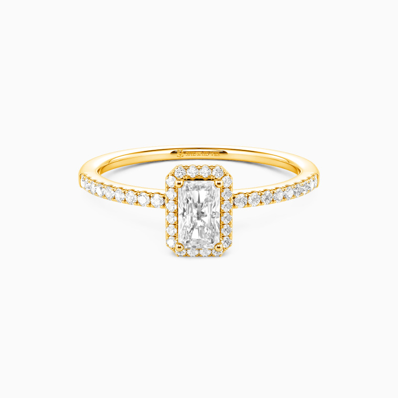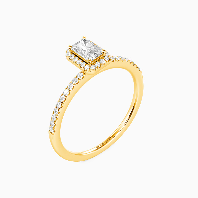 On the most important day, surprise her with this halo engagement ring. This exquisite style sets a brilliant radiant-cut stone in the center, surrounded by a shimmering halo frame. Set along the shank is a well-arranged row of paved accents. The excellent luster reflects all the glamour this ring can take to you. Your vision of love has been restarted since the day you met her.