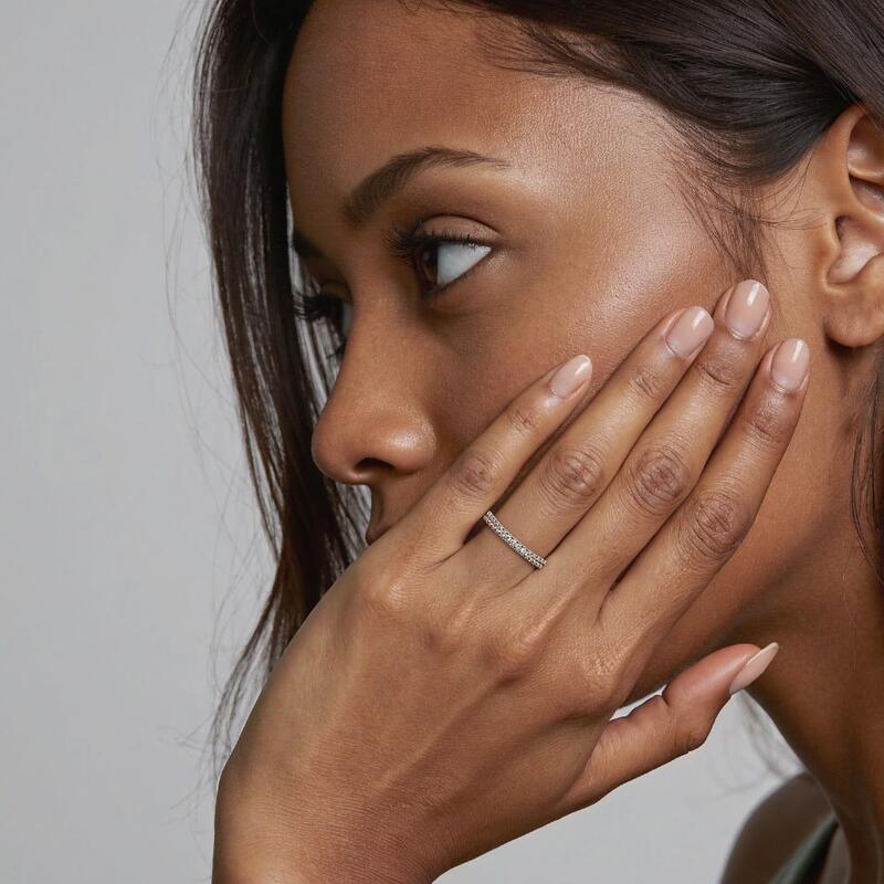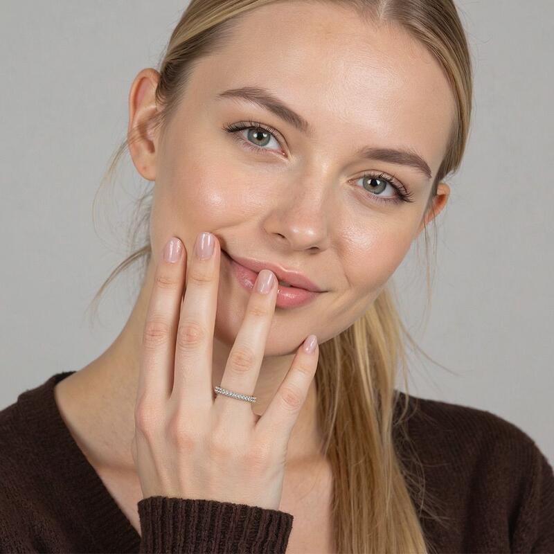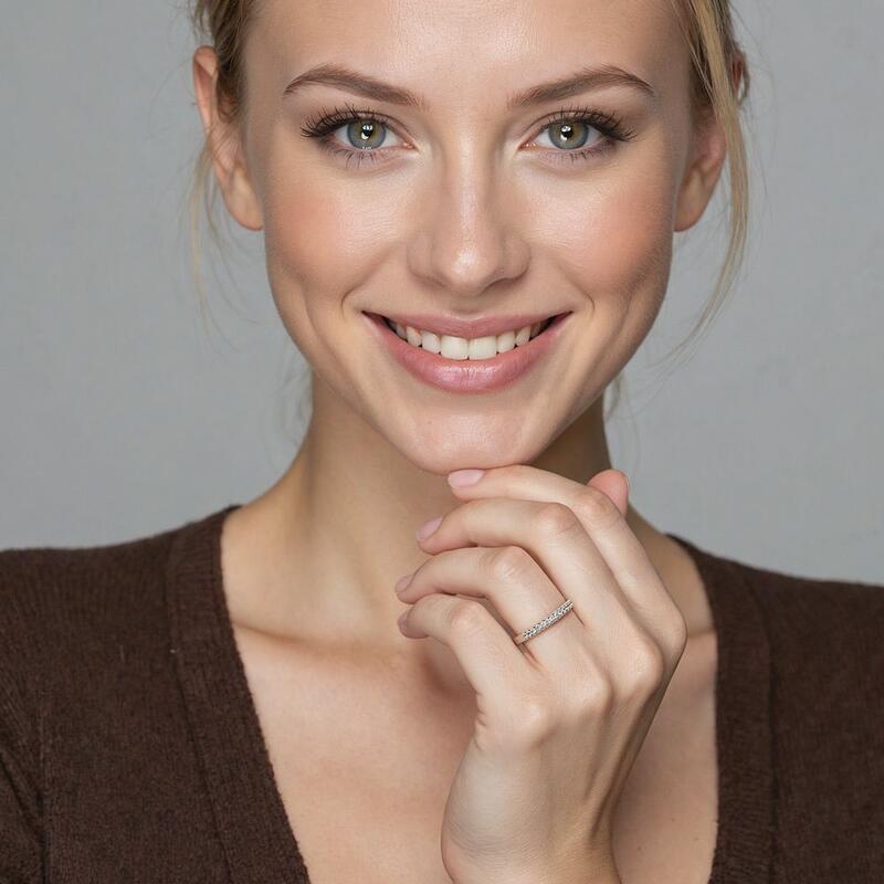 Gleaming accents and polished shank combine in a simple design you can wear every day. You could never go wrong with such a classic half eternity wedding band. It portrays your elegance effortlessly in its shining beauty. Stacking with your engagement ring or wearing it solo is both an ideal choice; this timeless design is a dazzling symbol of your love.