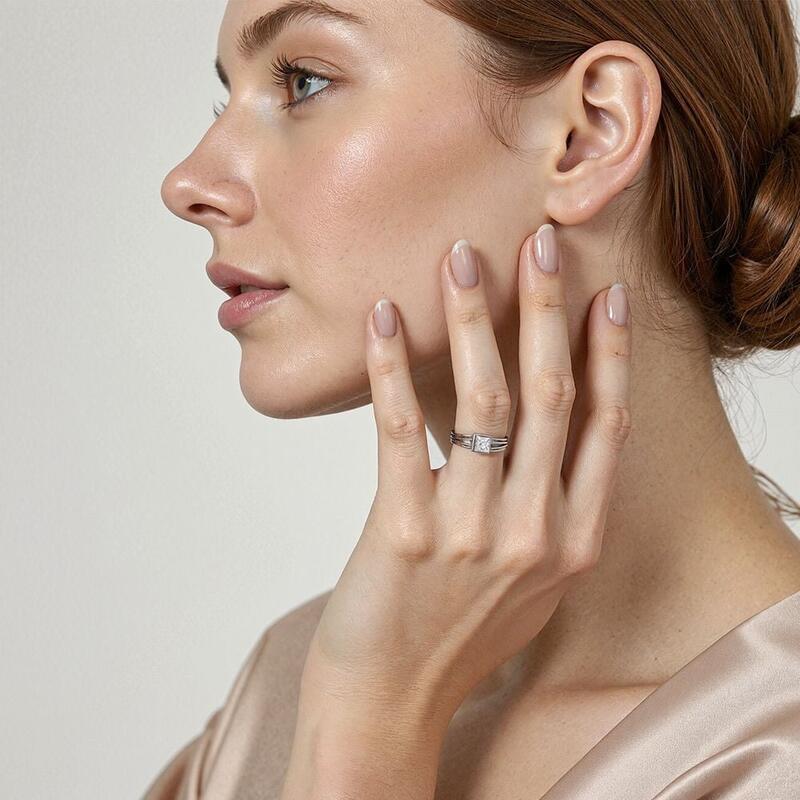 Stylish and modern. This beautiful solitaire engagement ring stands out for the glimmering princess-cut stone in the bezel. The polished finish and unique shank design make the brilliance of the center fully visible. It's an absolutely right choice for contemporary women.