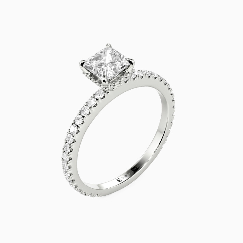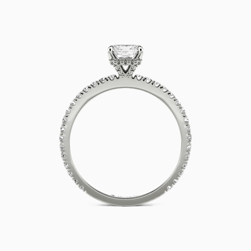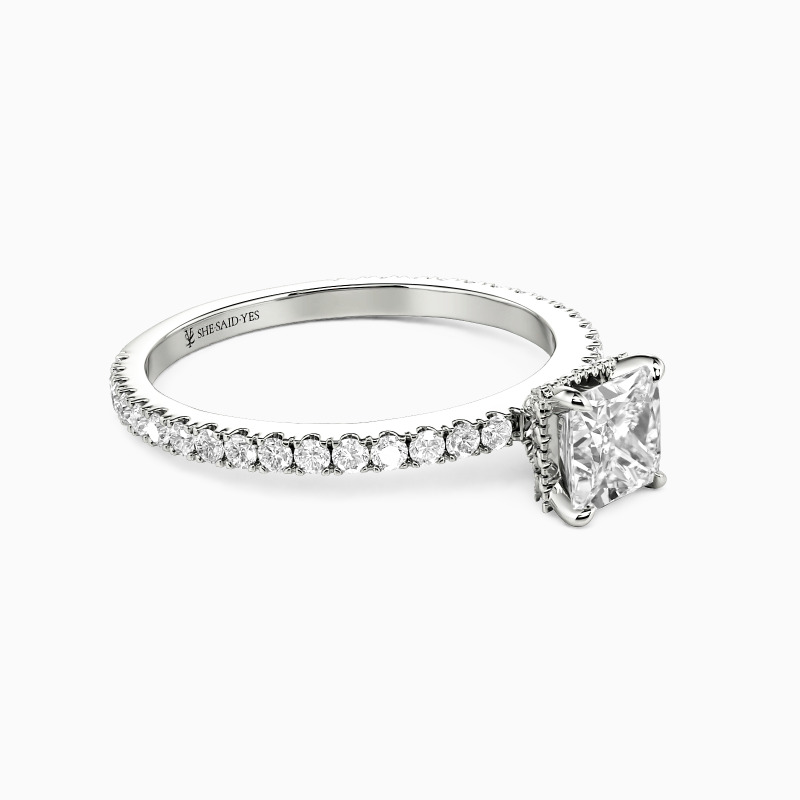 A timeless symbol of devotion, this engagement ring features a dazzling princess-cut center stone set within a delicate beaded basket, adding intricate charm. The pavé band glimmers with a continuous cascade of light, enhancing the ring’s brilliance. Elegant yet bold, this design balances modern sophistication with a touch of romantic craftsmanship.