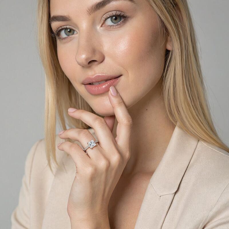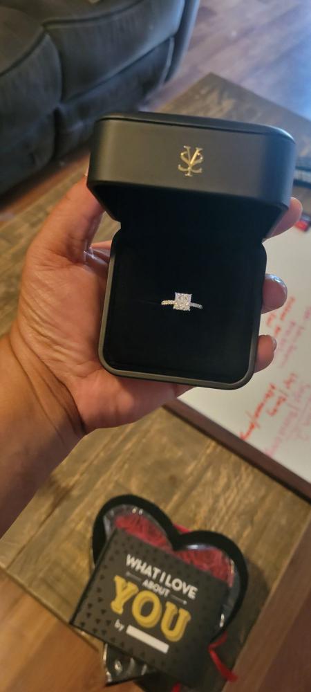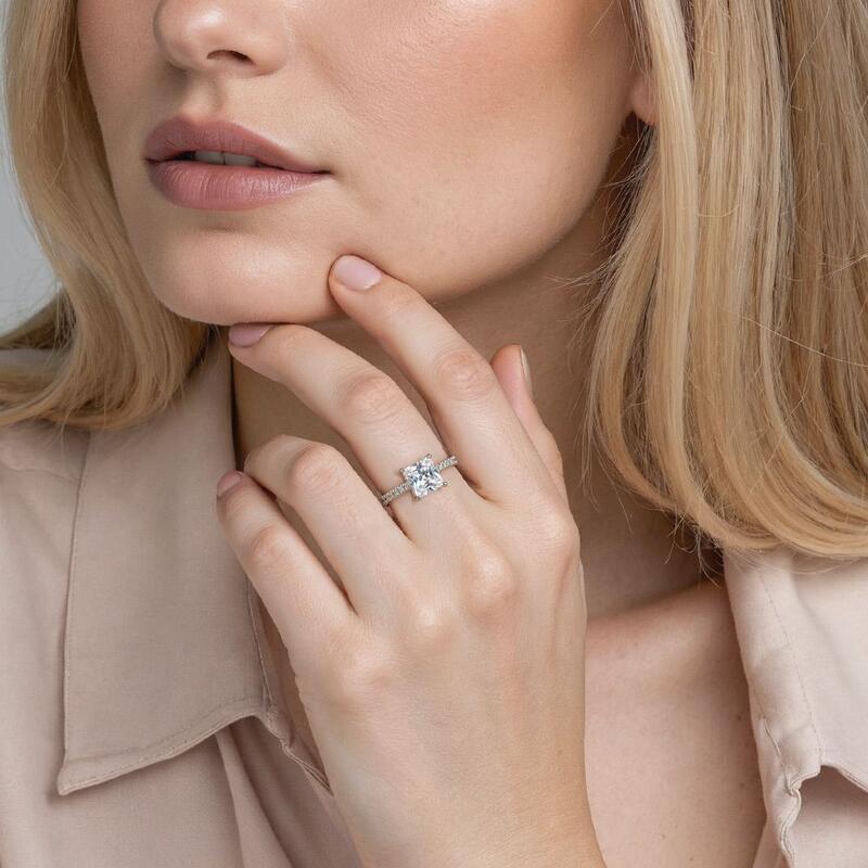 This enchanting engagement ring showcases a dazzling princess-cut center, exuding modern elegance. A hidden halo nestles beneath, revealing a secret sparkle from the side. The shank's delicate pavé accentuates the center's brilliance, creating a harmonious flow of light. Like a whisper of forever, this ring captures the enduring magic of your unique love story.