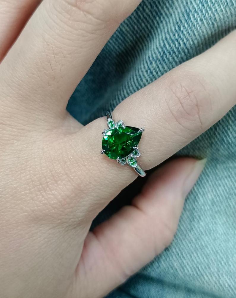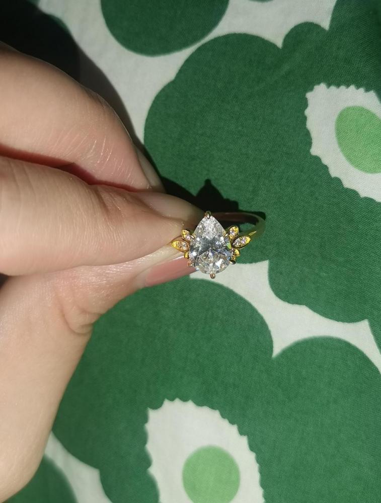 A charming side-stone engagement ring for women is beautifully crafted with a vintage style. This stunning piece features a sizable pear-cut stone held by precious claws. And several retro leaf patterns trim each side with shimmering round gems, showcasing an elegant beauty. It’s an excellent addition to her dream wedding.