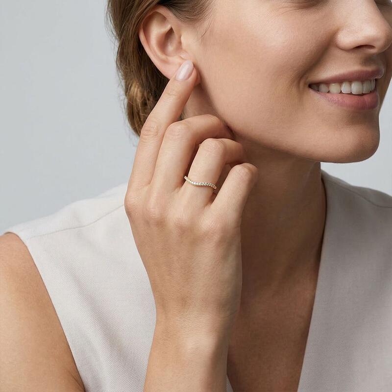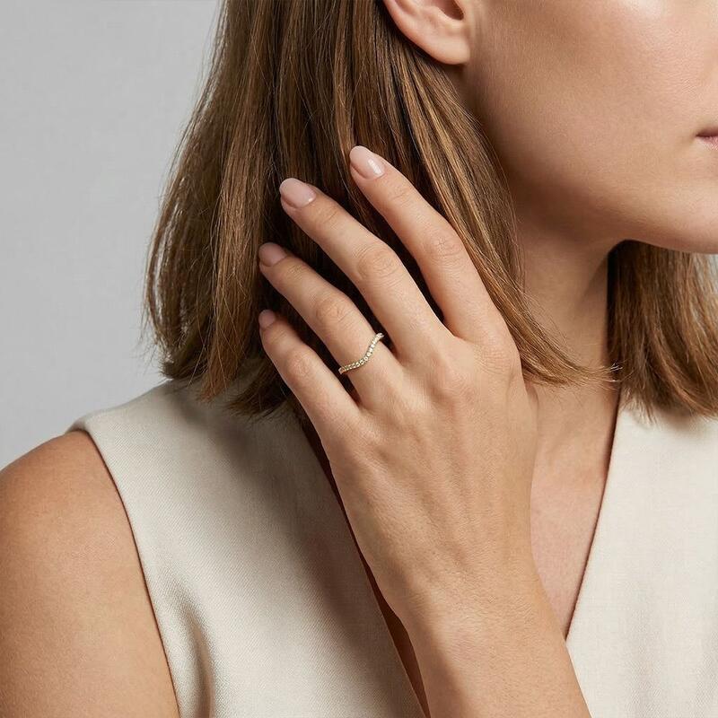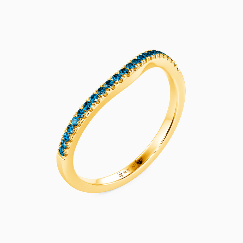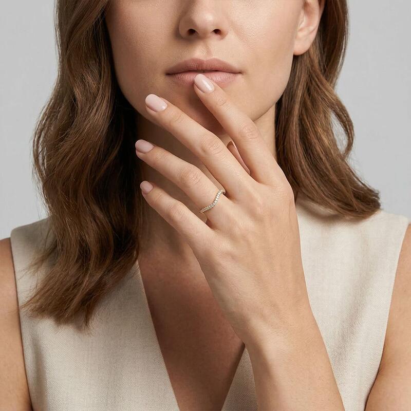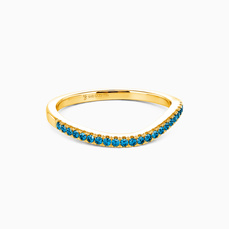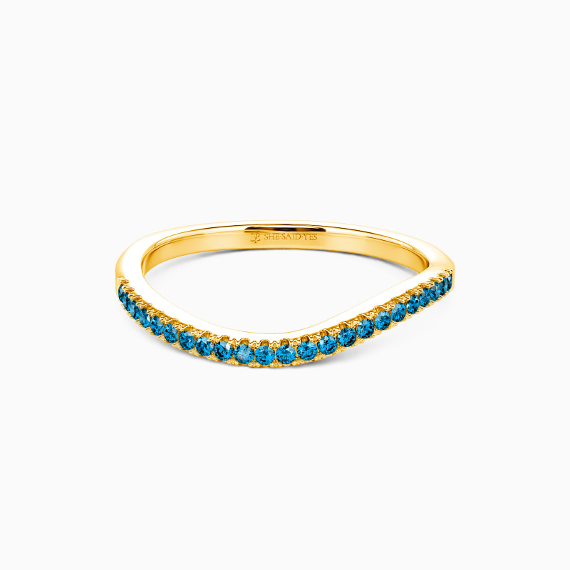 Classical and dainty. Crafted with a polished metal of your choice, this wedding band is brightened by a row of shimmering round stones on a subtle waved shank. The elegant piece you can wear solo or team with other accessories from SHE·SAID·YES.