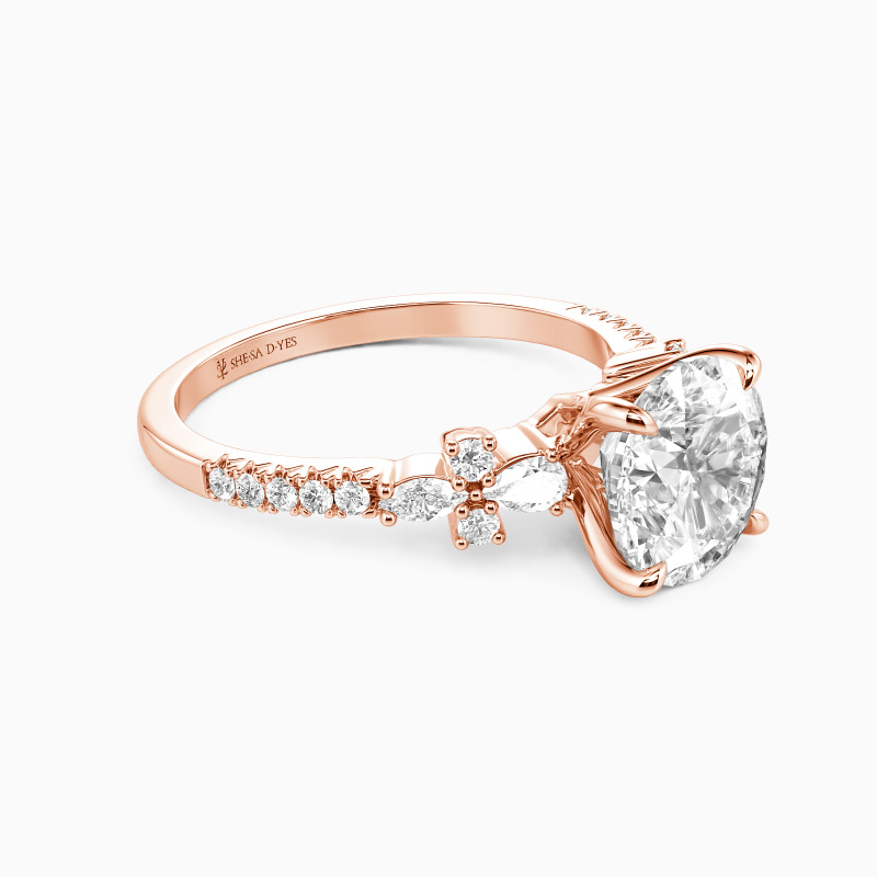 A romantic side-stone engagement ring showcases a brilliant round-cut center stone nestled in a floral-inspired setting, like a blossom unfurling. Graceful cross-motif gem clusters frame the sides, blending symbolism with artistry. The French pavé shank sparkles softly, while milgrain edging adds a whisper of vintage elegance—ideal for the bride who loves meaningful details and timeless beauty.