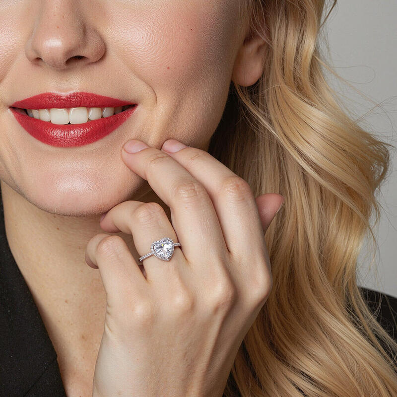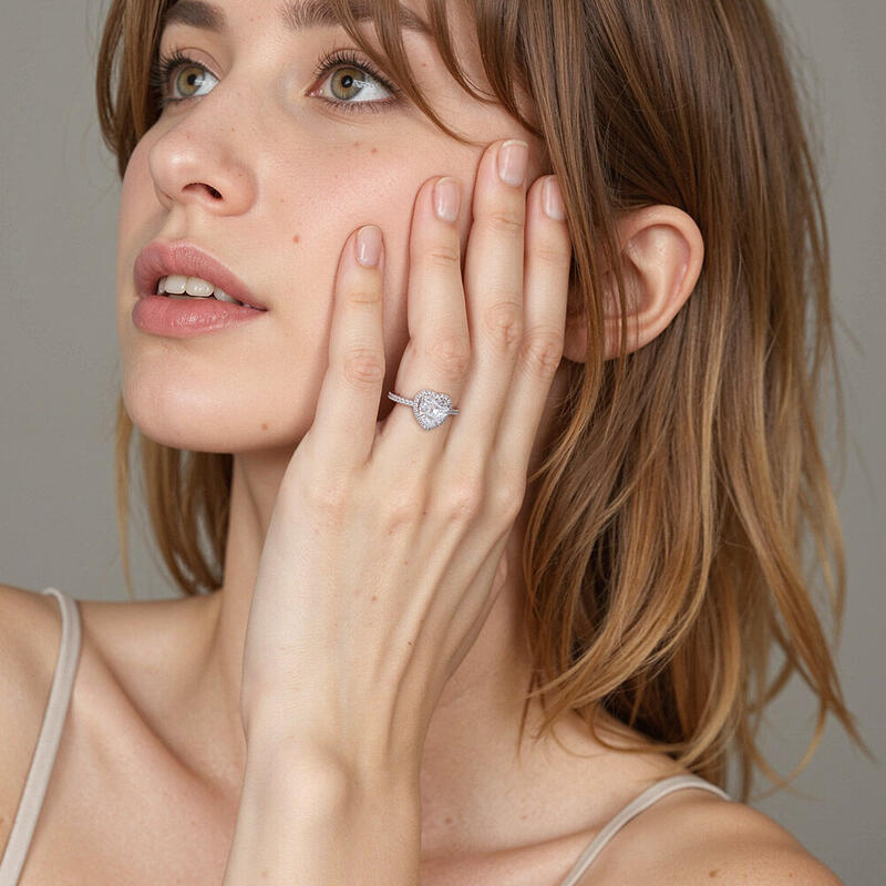 Surrounded by a circle of sparkling stones, the center stone is highlighted as a whole. With exquisite and elegant design, this heart halo engagement ring is full of loyalty to wear. You are my everything, giving my heart to you is the most romantic thing in my life.