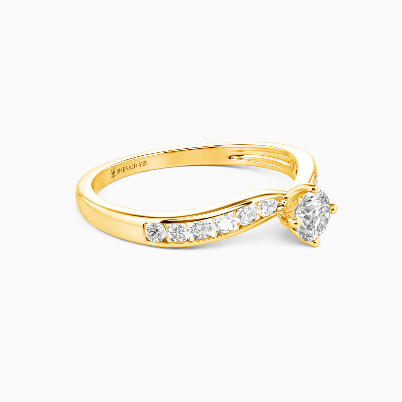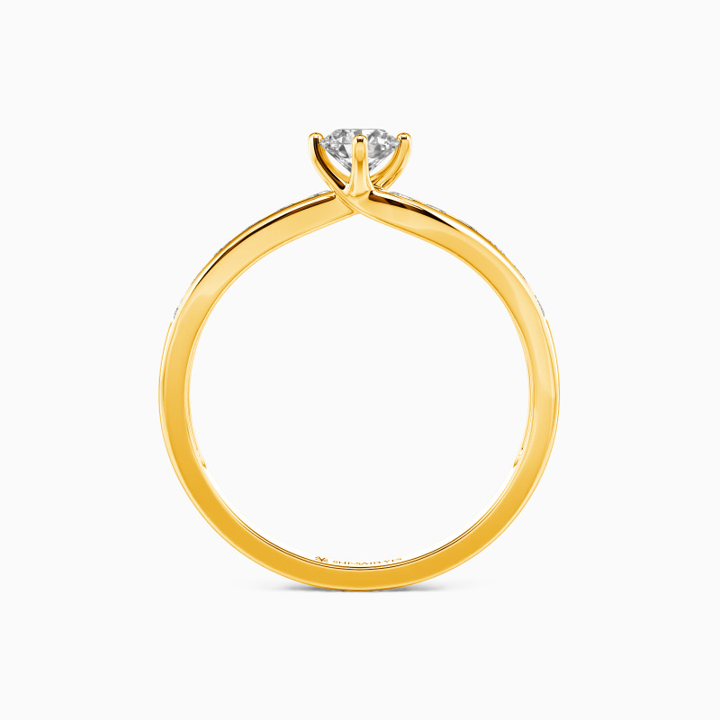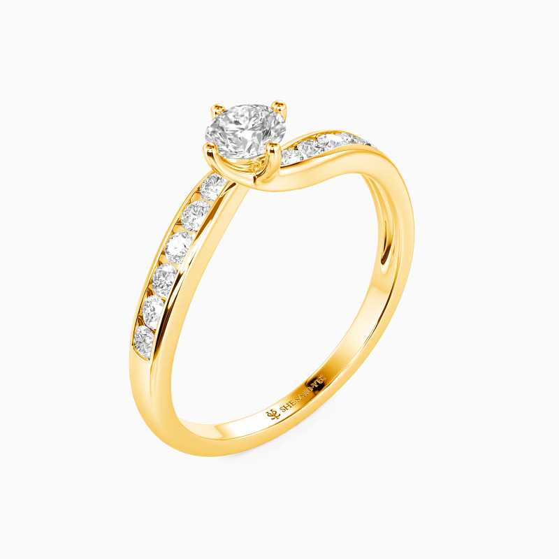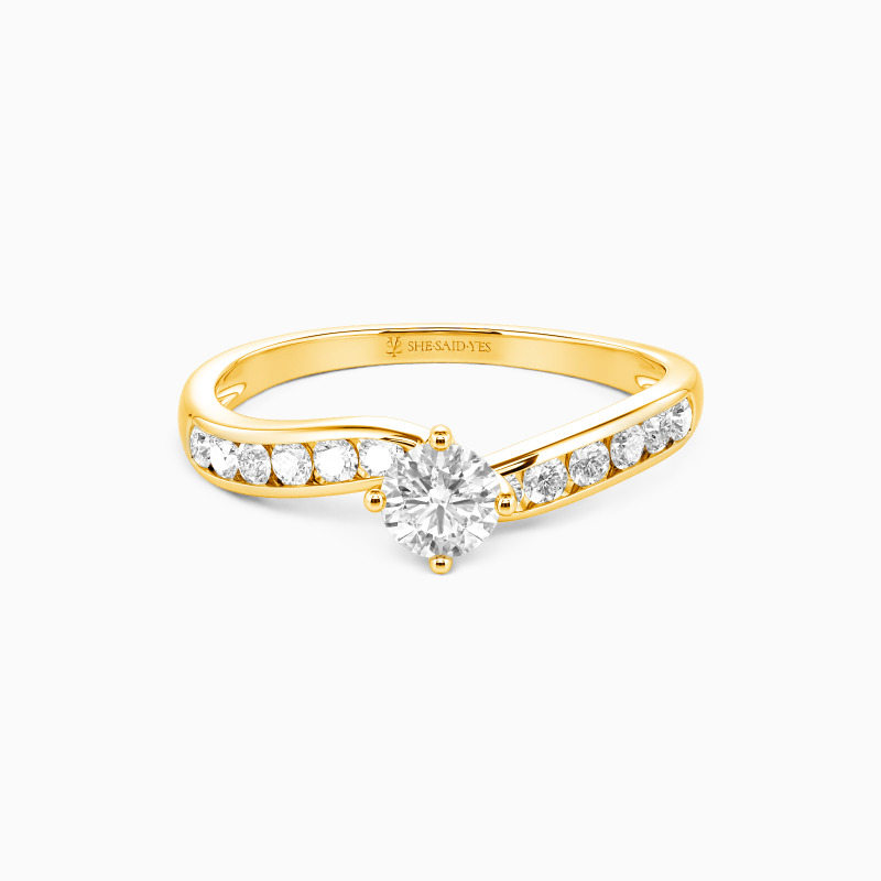 This stylish side stone engagement ring attracts you with the dazzling round-cut center stone set in four polished prongs. And its bypass shank, studded with small luscious accents in a channel setting, creates a brilliant halo to enhance the overall look. You are my first preference and the only last option.