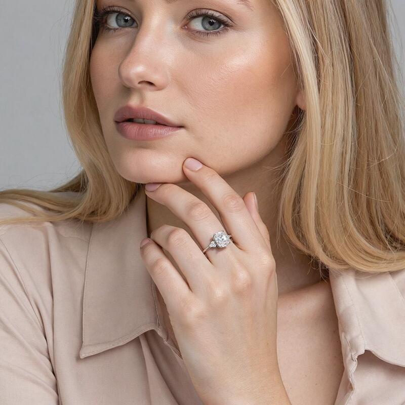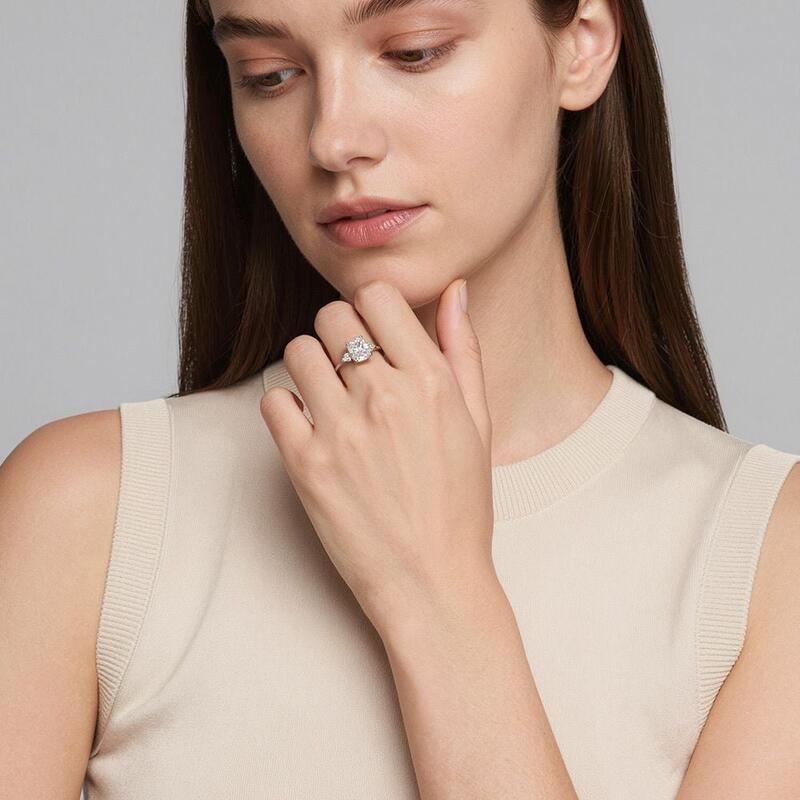 Elegant and delicate, this engagement ring features a dazzling elongated cushion center stone. Three smaller round-cut gems complete a floral look to elevate the brilliance, embellished on each side. This chic design definitely wins her love.
