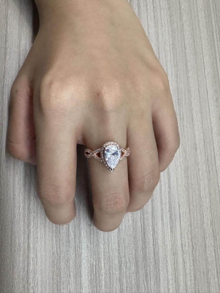 This unique halo ring features a pear-shaped stone in the middle and a delicately twisted shank, which shows simple elegance. The surrounding halo stones make the center stone more impressive, and the vine-like pattern engraved on the side of the basket creates a vintage style.