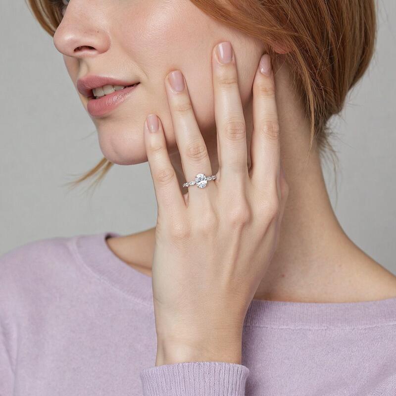 Capture the essence of timeless love with this exquisite engagement ring. Boasting a stunning oval-cut center stone, elegantly nestled in four claws, this ring is a symbol of everlasting commitment and beauty. Meanwhile, the hidden halo and delicately set side stones in marquise and round shape add more elegance and brilliance to the entire piece. Make a statement that will be cherished forever with this captivating engagement ring.