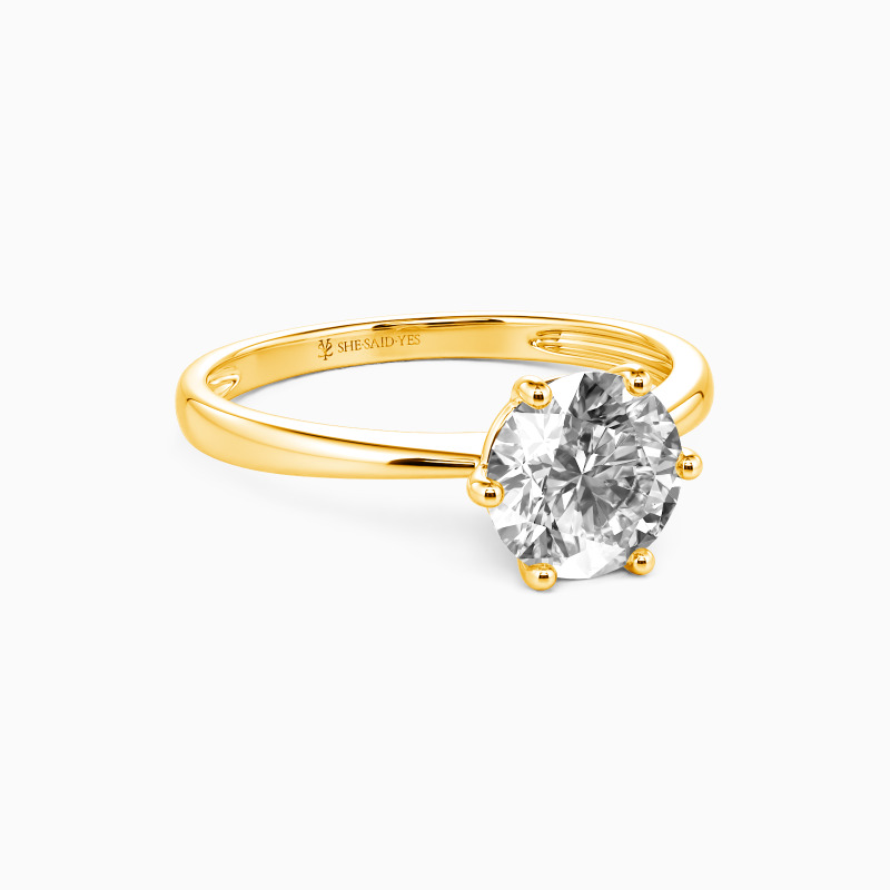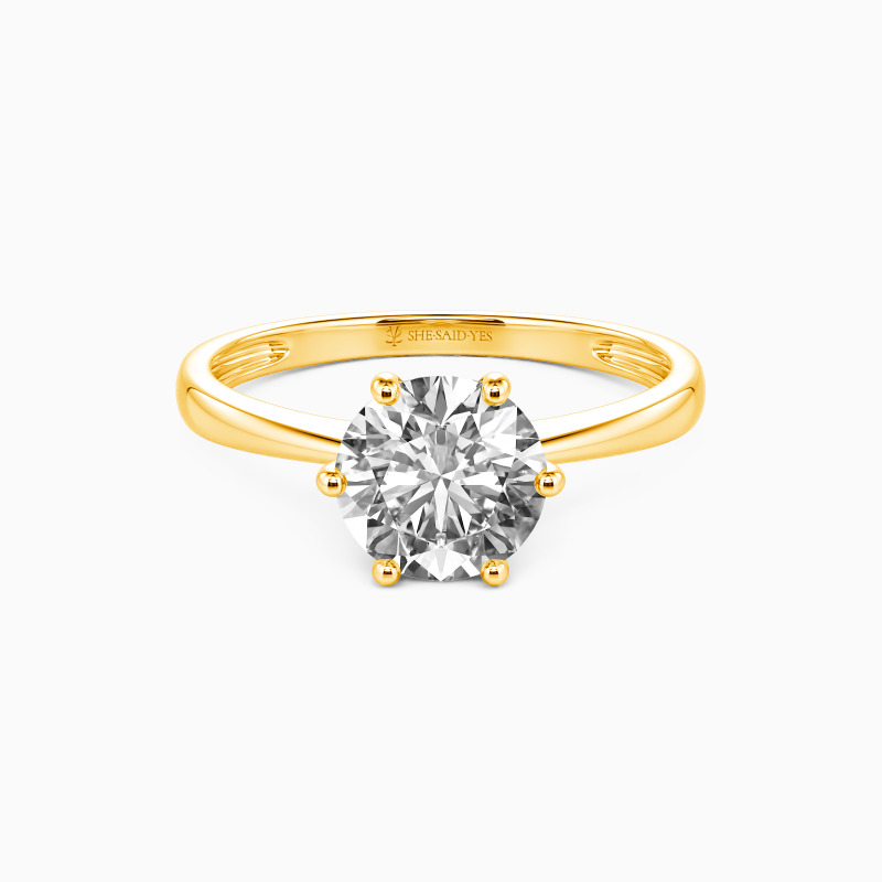 This brilliant six-prong solitaire features clean, finest lines and exquisitely tapered shoulders arching toward the center stone. With this solitaire design, you will forever be in that shine state of mind.
