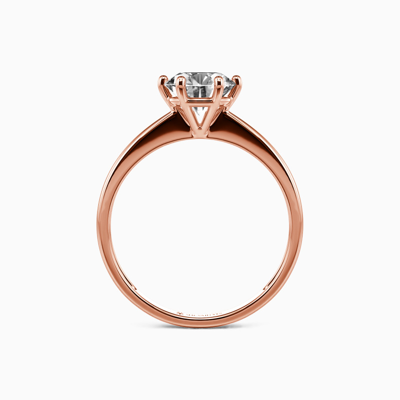 This brilliant six-prong solitaire features clean, finest lines and exquisitely tapered shoulders arching toward the center stone. With this solitaire design, you will forever be in that shine state of mind.