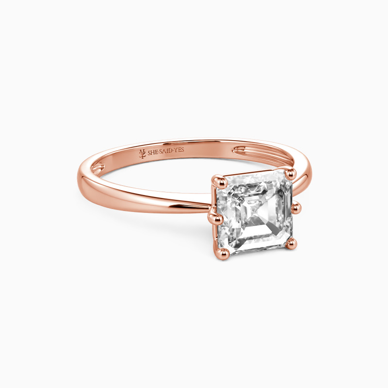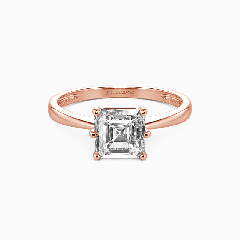 This brilliant Asscher cut solitaire features clean, finest lines and exquisitely tapered shoulders arching toward the center stone. With this solitaire design, you will forever be in that shine state of mind.