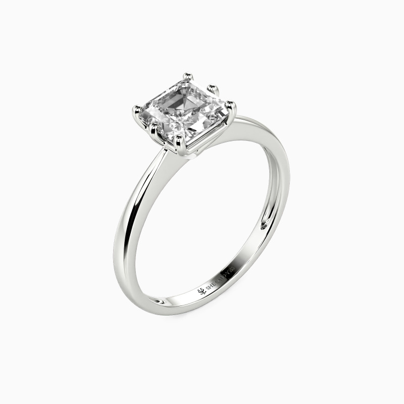 This brilliant Asscher cut solitaire features clean, finest lines and exquisitely tapered shoulders arching toward the center stone. With this solitaire design, you will forever be in that shine state of mind.