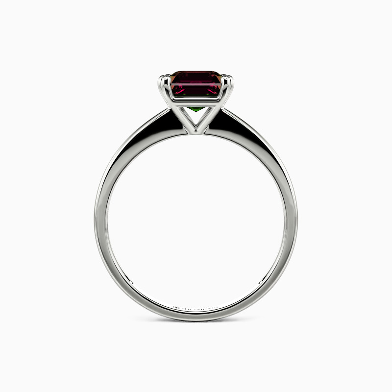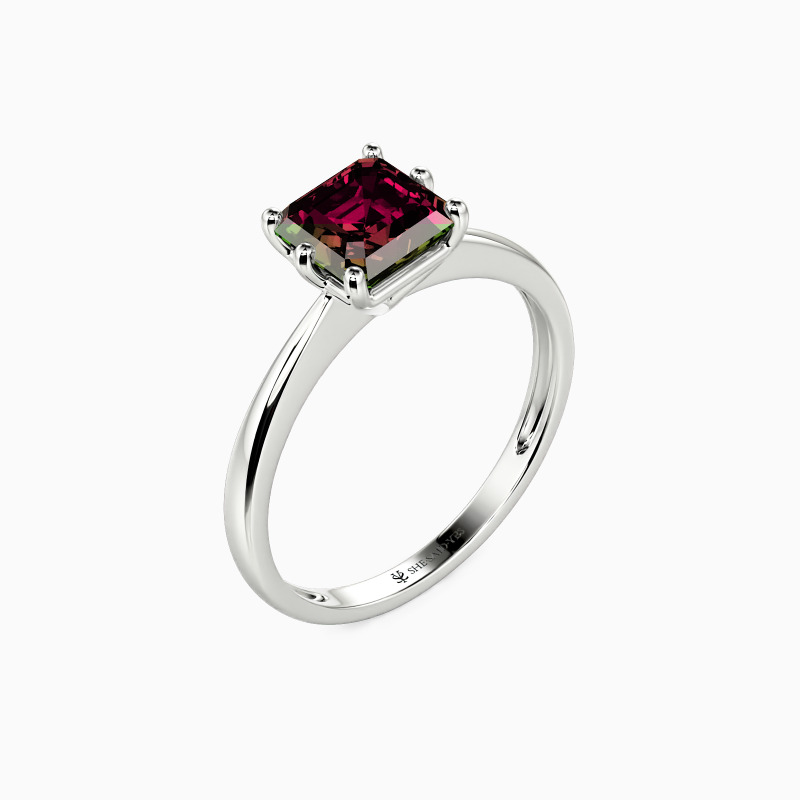 This brilliant Asscher cut solitaire features clean, finest lines and exquisitely tapered shoulders arching toward the center stone. With this solitaire design, you will forever be in that shine state of mind.