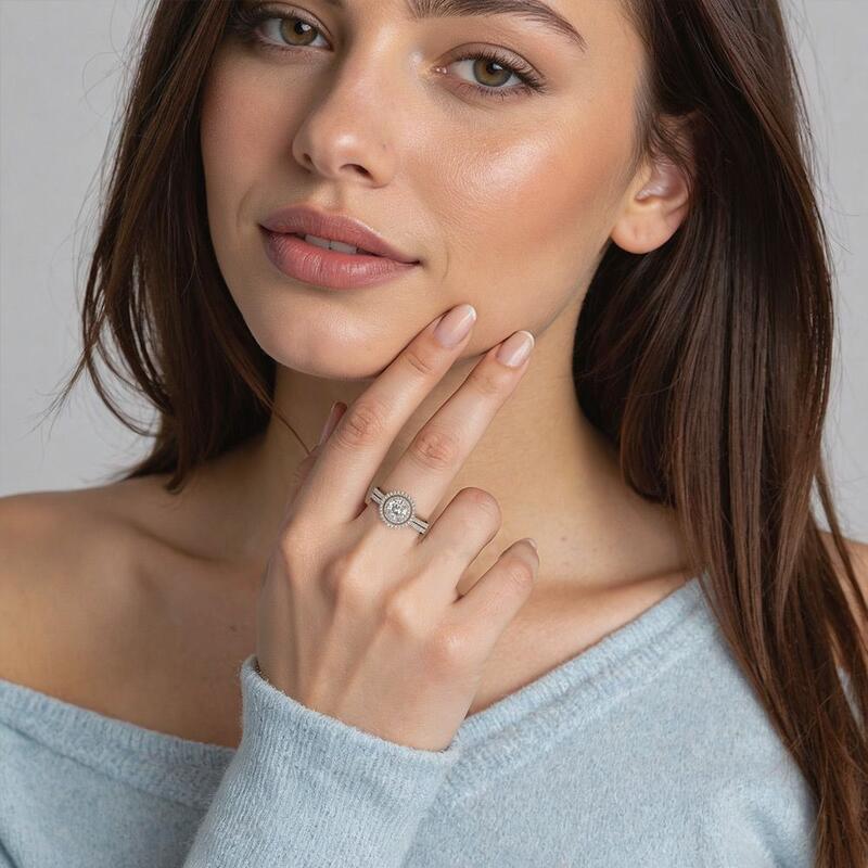Featuring a dazzling round-cut center stone in a classic prong setting, this set is designed to take your breath away. A stunning halo surrounds the exquisite center stone, adding a luxurious touch of brilliance to the design. The matching wedding band is also designed as a striking circle, completing a double halo look with the engagement ring. This bridal set is the perfect declaration of your love and commitment. Its timeless design ensures that it will remain a cherished part of your jewelry collection for years to come, a stunning reminder of your special day.