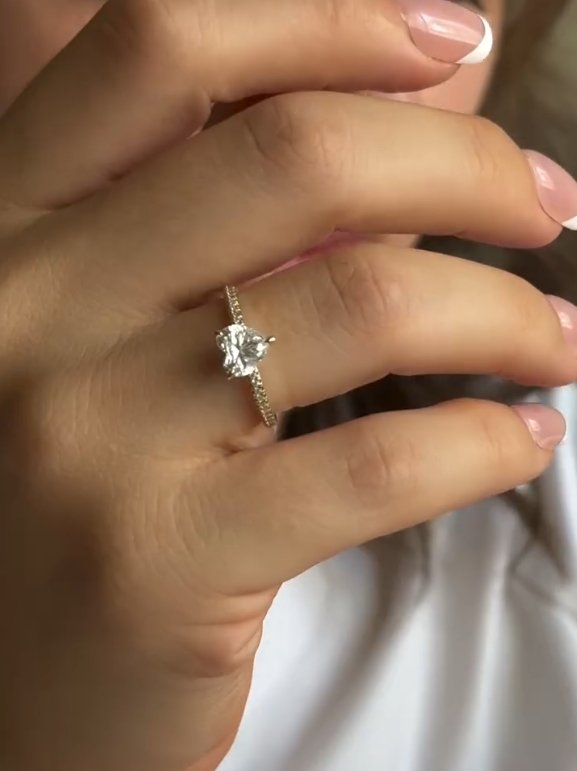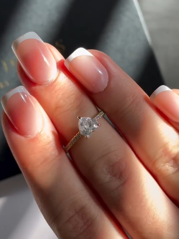 Attracting your eyes with the shimmering heart-cut center stone in a classic prong setting, this delicate engagement ring adds extra splendid charm and magnificence to you by studding a series of brilliant pavéd accents on the shank. You are magical, and you play through my mind like a symphony.