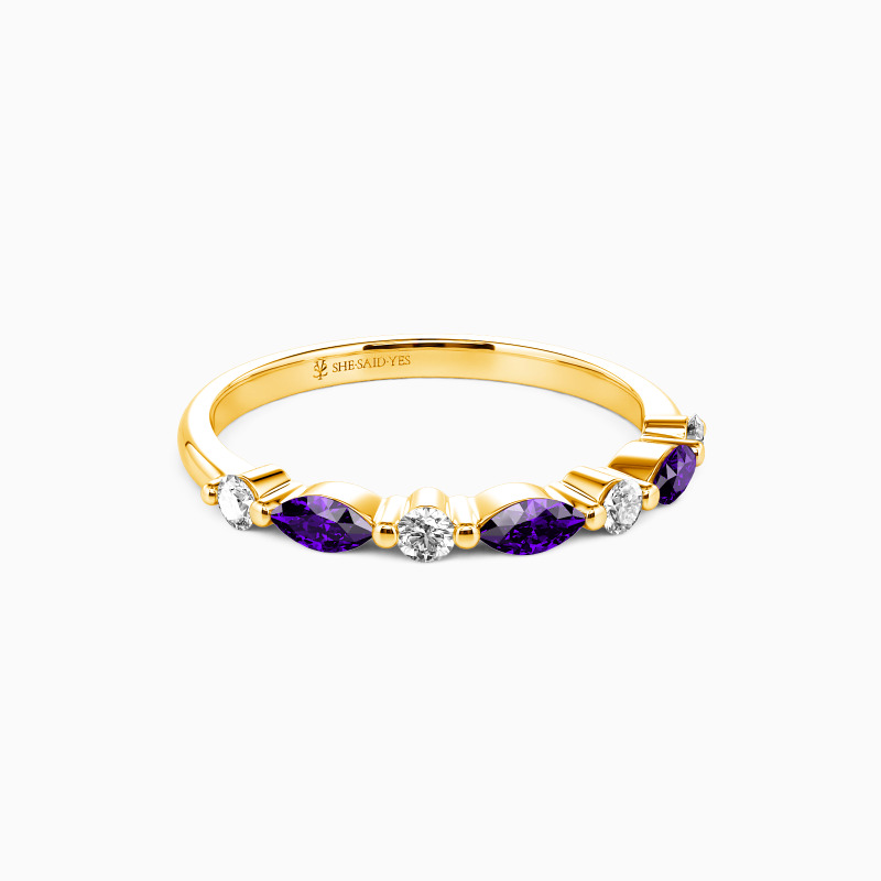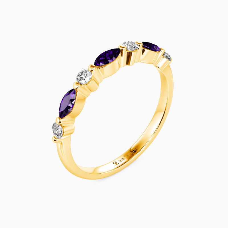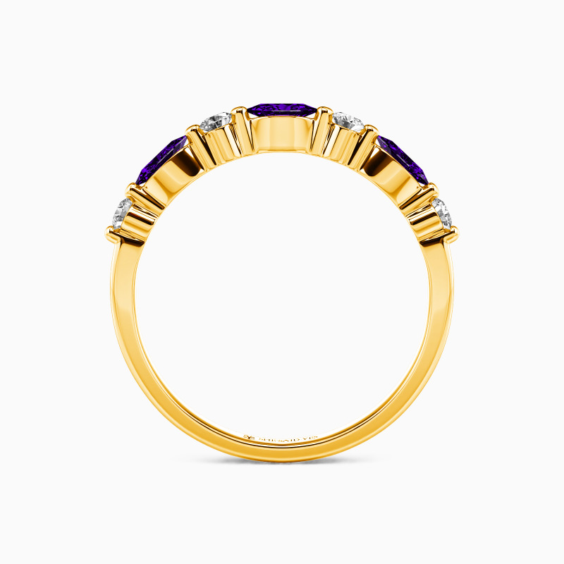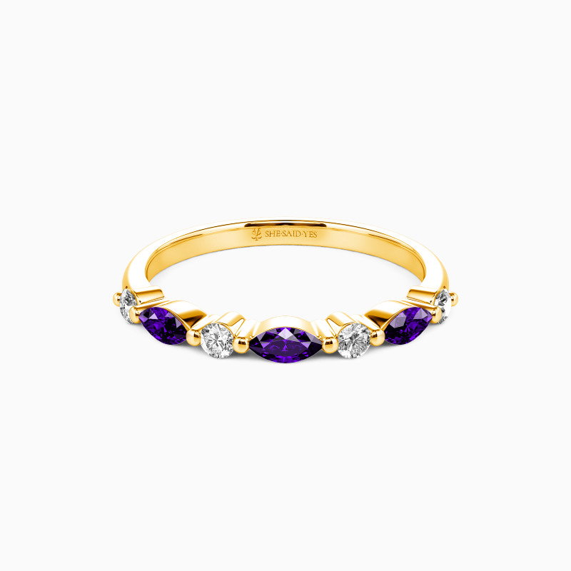 Elegant and captivating, this classic wedding band is an ideal complement to engagement rings. It features a harmonious blend of round and marquise-cut stones, meticulously set in shared prongs along the polished shank. The alternating arrangement of these stones creates a mesmerizing pattern that exudes a radiant sparkle from all perspectives. This band not only enhances your allure but also adds an enchanting shimmer to every gesture.