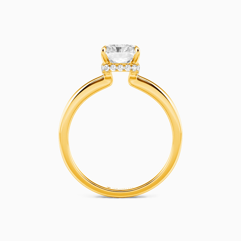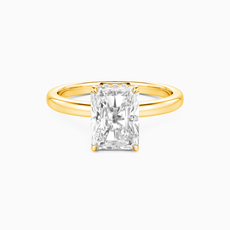 Exquisite and modern, this engagement ring showcases a dazzling radiant-cut centerpiece, its brilliance amplified by a delicate hidden halo. The sleek band gracefully rises to embrace the stone, creating an elegant silhouette. With its clean lines and subtle sparkle, this ring embodies contemporary romance, making it a timeless symbol of your love and commitment.