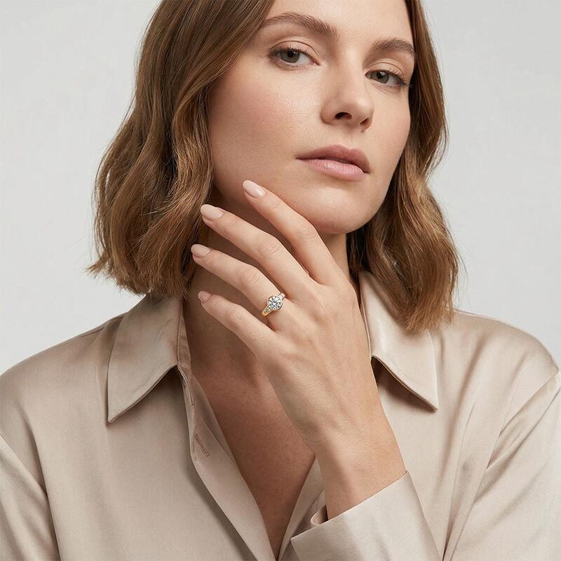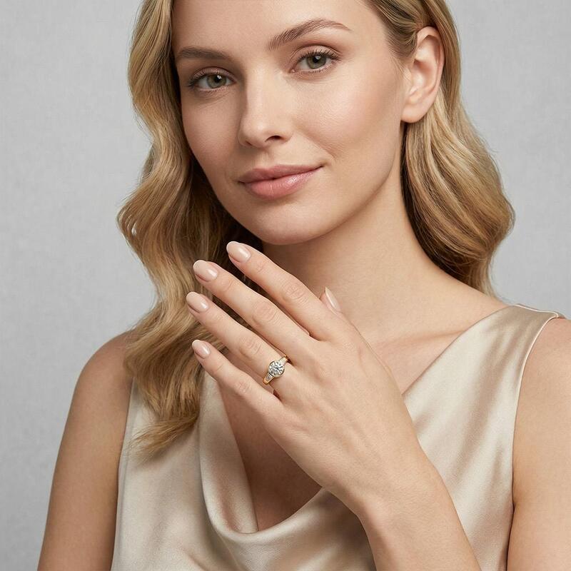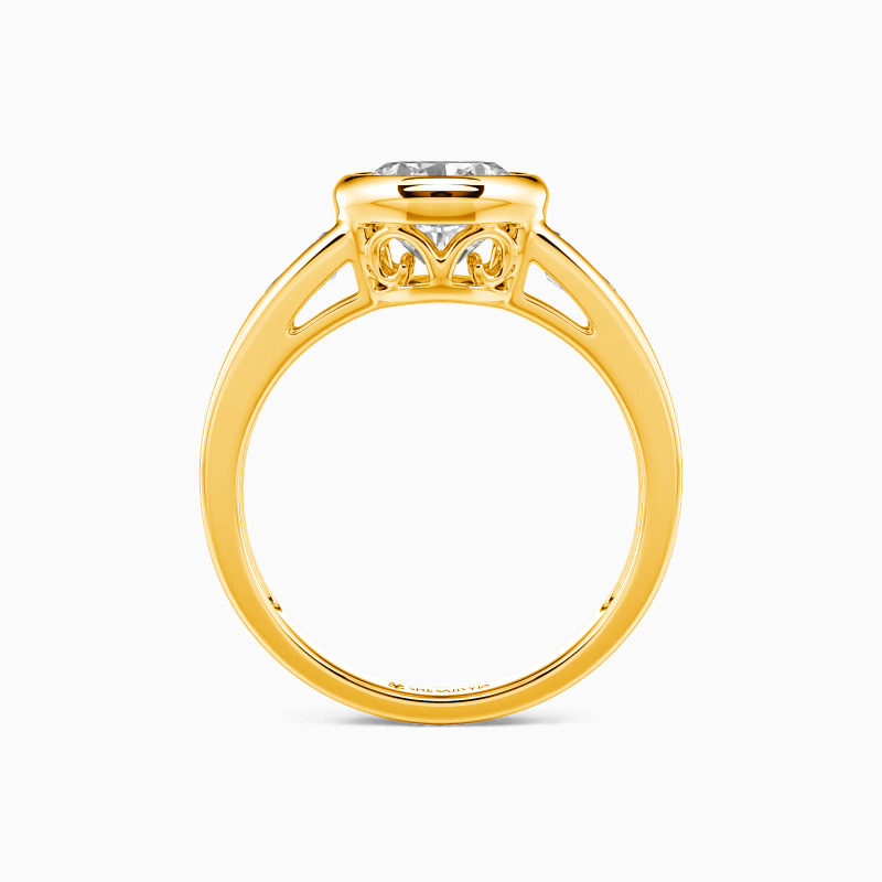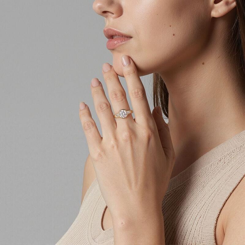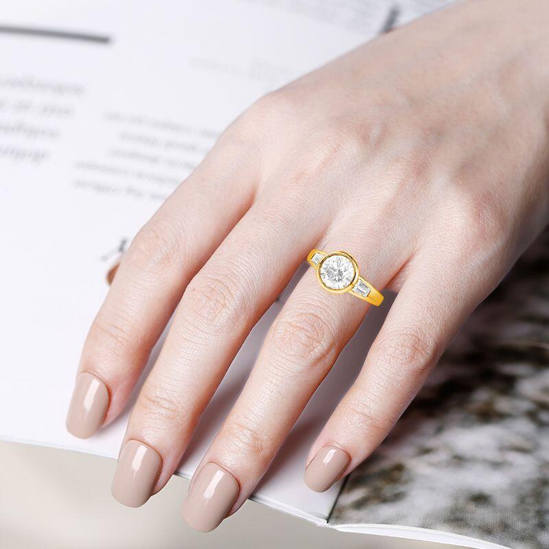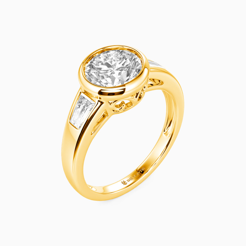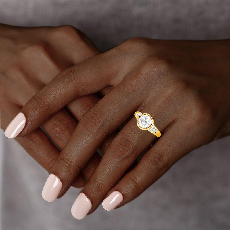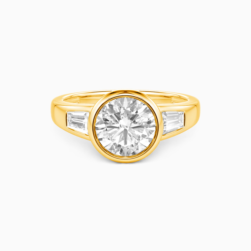 A timeless symbol of love's past, present, and future, this elegant three-stone ring features a luminous round center stone embraced by sleek trapezoid gems. The clean lines of the bezel setting enhance its modern sophistication while ensuring a secure, seamless glow. A harmonious balance of geometry and brilliance, perfect for a love that shines eternally.