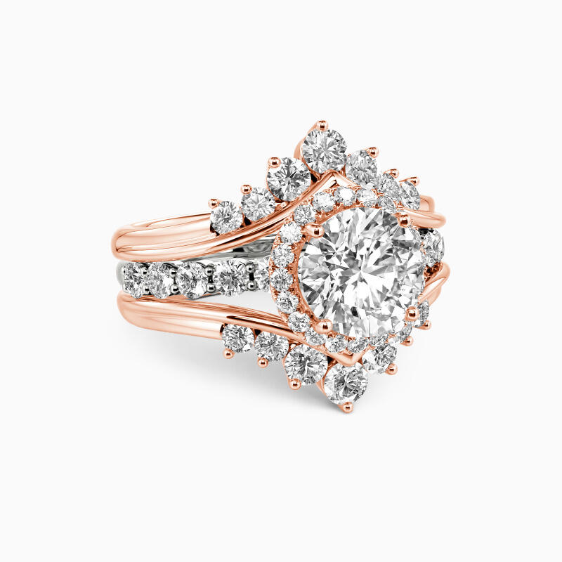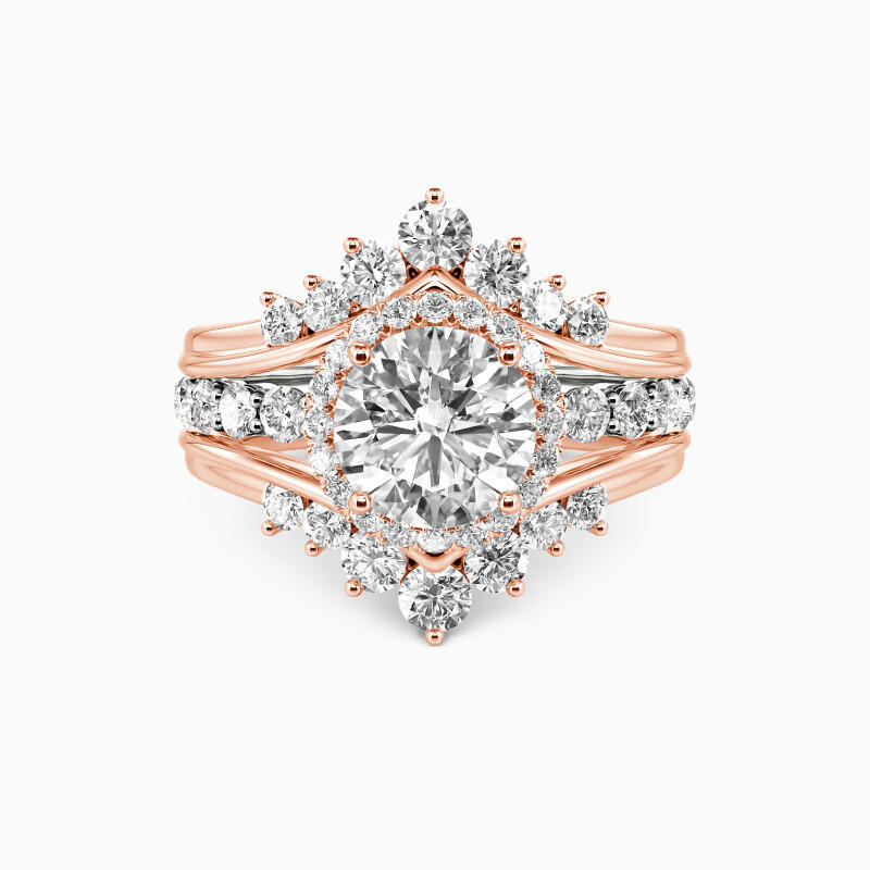 Designed to evoke your innate elegance and charm, this beautiful set showcases a sparkling round cut center stone wrapped in a halo frame, while additional shimmering stones adorn the chevron shank. The inner band is brightened by a half-circle of round stones, completing the fabulous triple split shank design. This interchangeable style bridal set would skip a beat for many and will bedazzle your ensemble. The perfect gift for her.