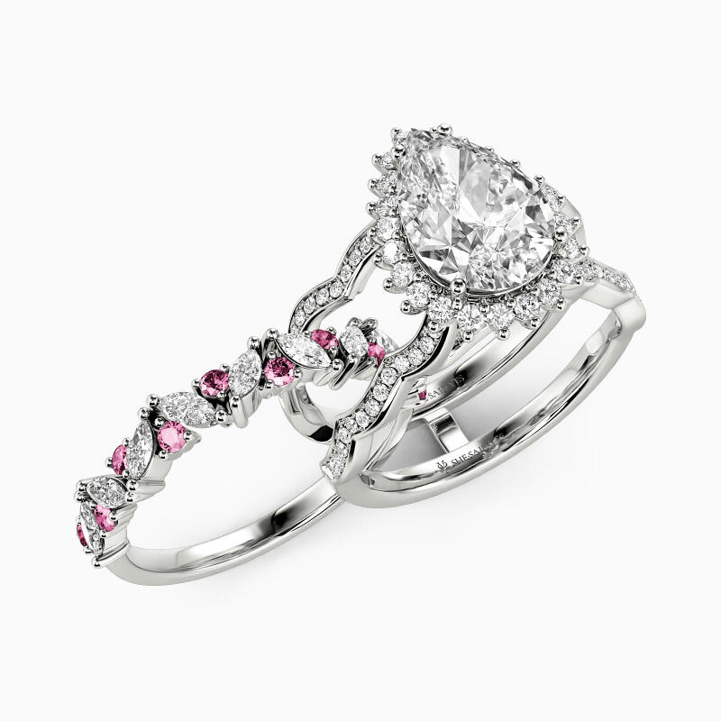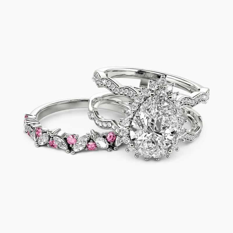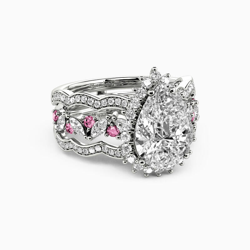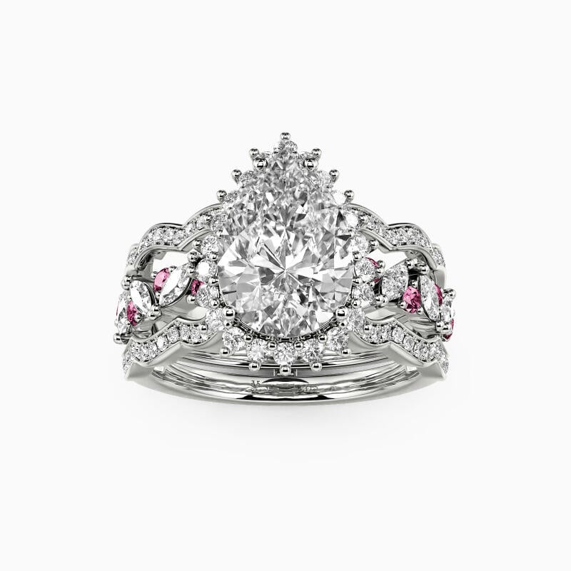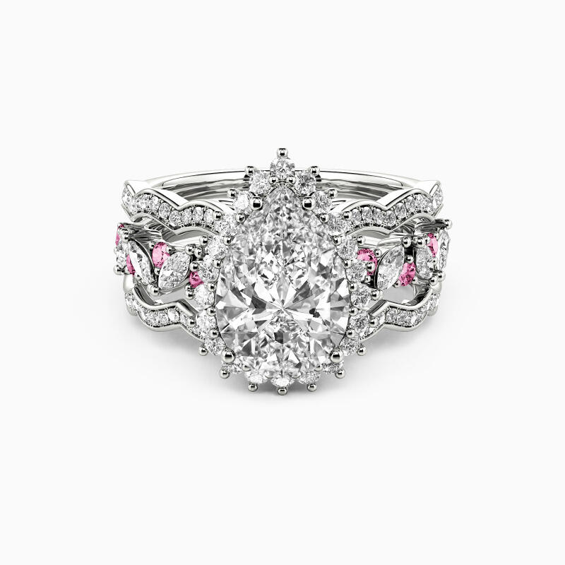 Reveal your admiration for this cherished ring and feel its gorgeousness. Set with the shining pear-cut stone in the center wrapped by a glistening halo, it sparkles on the wavy shank. Matching the band accents with marquise and round-cut stones arranged in beautiful clusters, this interchangeable bridal set lends an endless glamour to every woman.