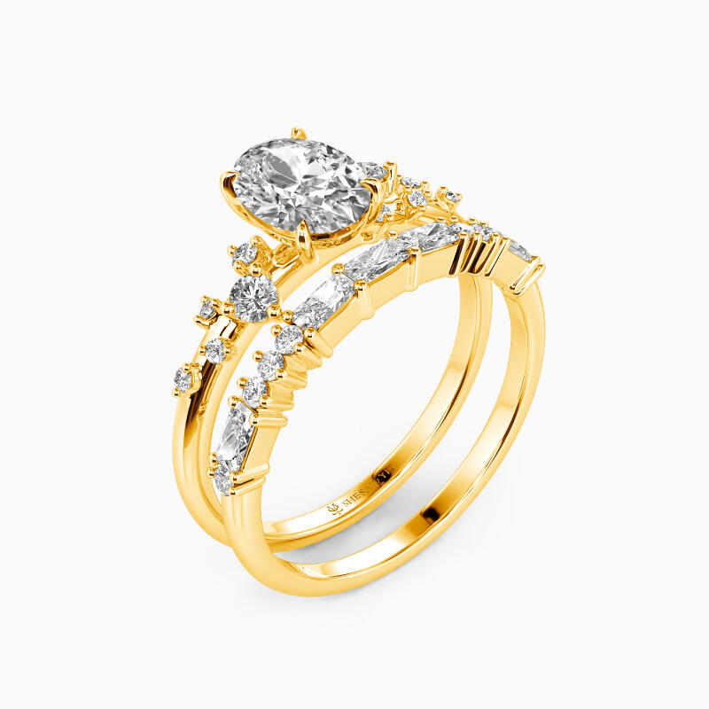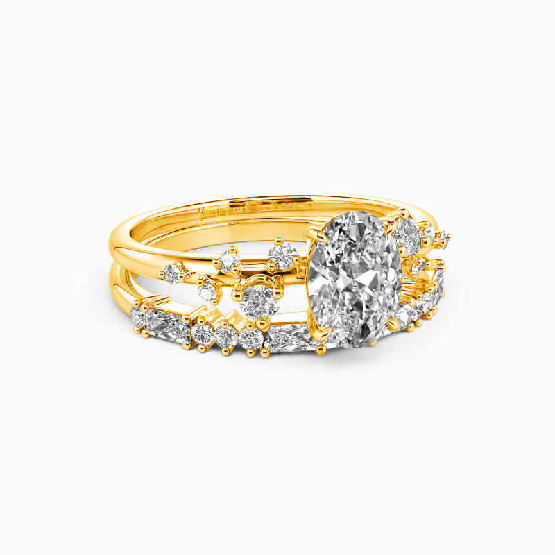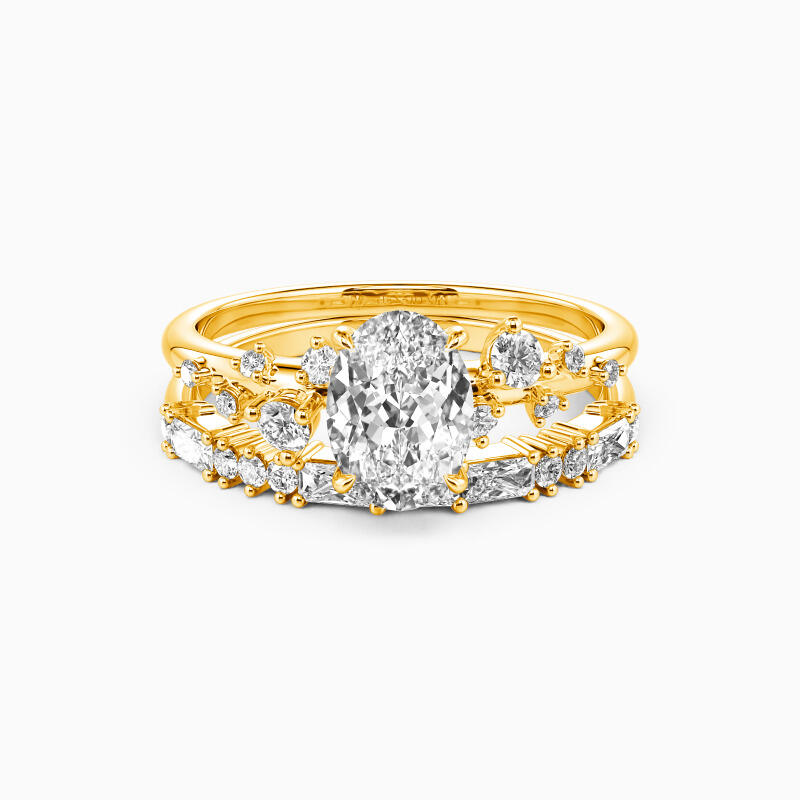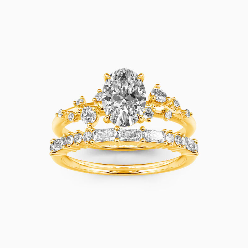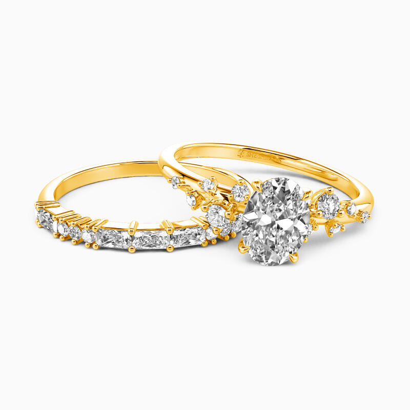 Make a chic first impression with this dazzling bridal set. An oval-cut solitaire center stone takes center stage, gracefully complemented by five round gemstones artfully scattered in varying sizes on each side. The slim shank wedding band intensifies the glamour further with the addition of dimensional round and emerald-cut gemstones. This set is a testament to timeless elegance, designed to illuminate your love story with its unmatched brilliance and charm.