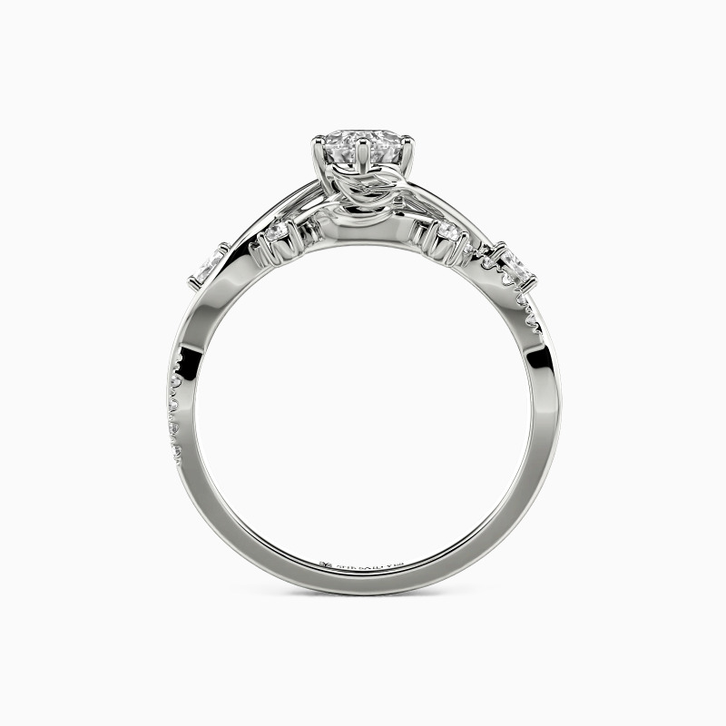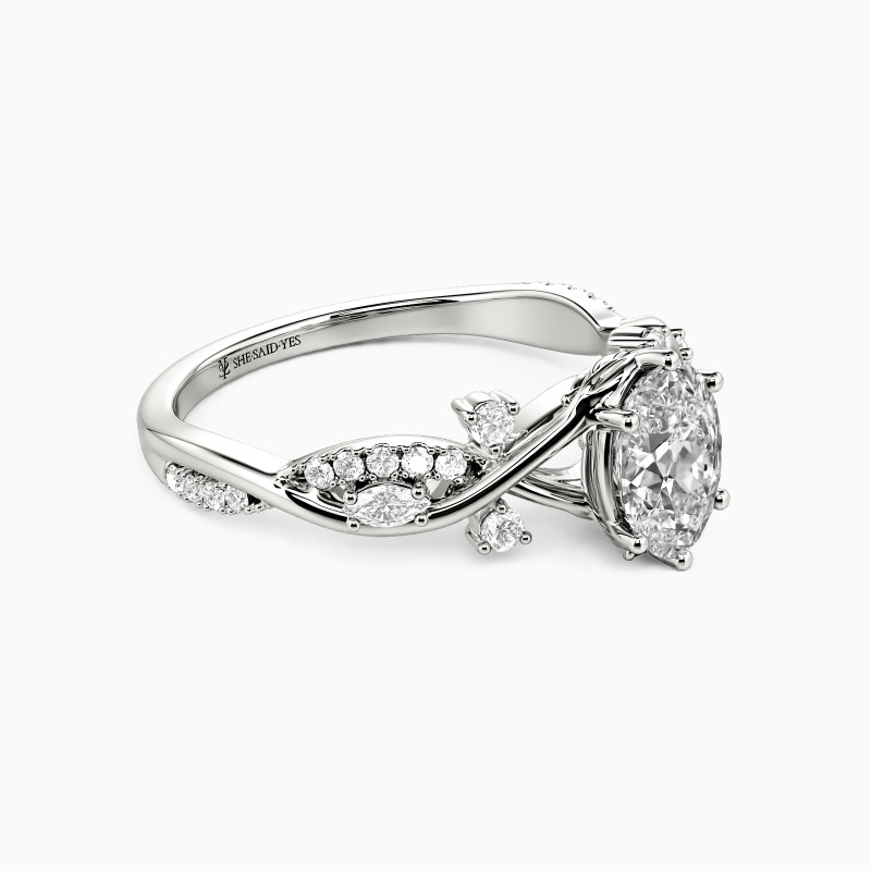 This nature-inspired ring features an exquisite oval-cut center stone gently embraced by delicate leaf-pattern motifs. The design flows seamlessly into a gracefully twisted shank, evoking the tender growth of a vine. Accents of round and marquise stones add a subtle, dew-like sparkle, creating a piece of organic, enchanting beauty. The romantic, handcrafted details evoke a fairytale woodland aesthetic—perfect for the free-spirited bride who dreams of eternal love intertwined with nature’s beauty.