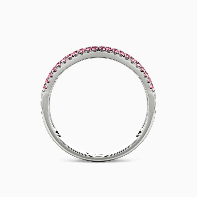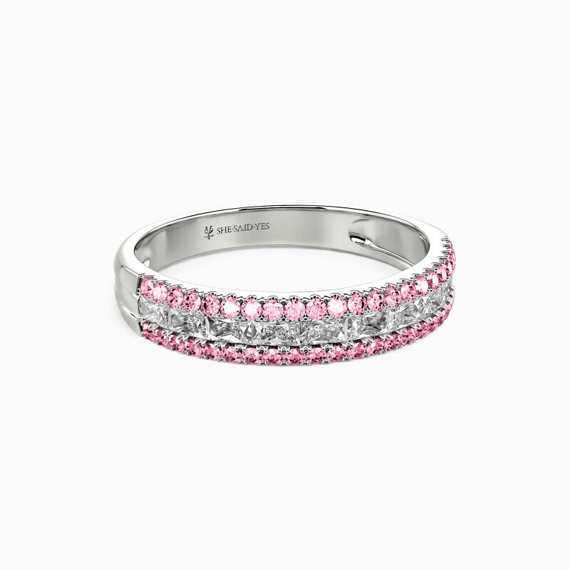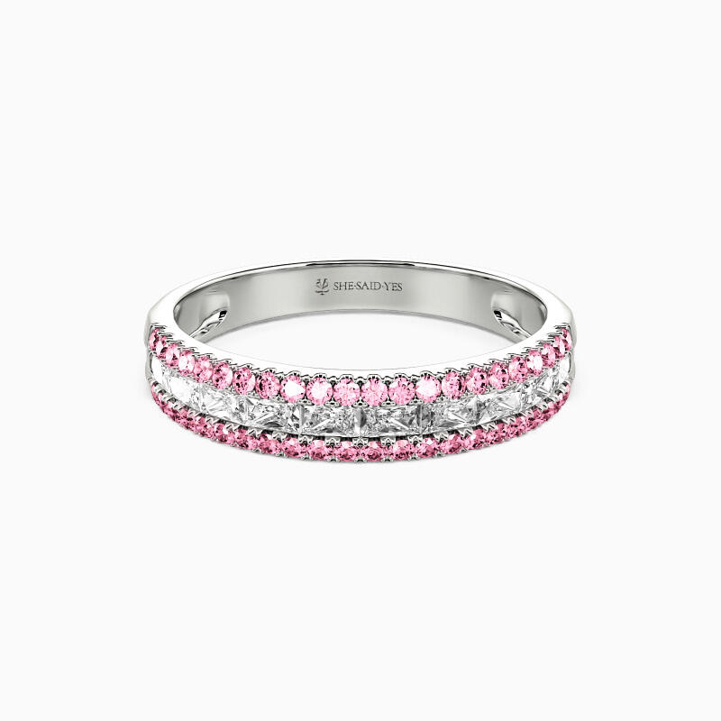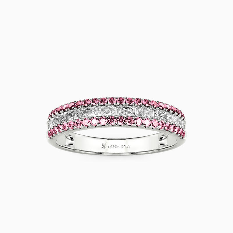 On your special day, this classic wedding band coordinating creates a spectacular ensemble with your engagement ring. A row of emerald-cut stone in a channel setting shines with two rows of surrounding round-cut stones. The brilliance of this beauty will light up your hand and glamour. Show off your high voltage sparkle with this classic band.
