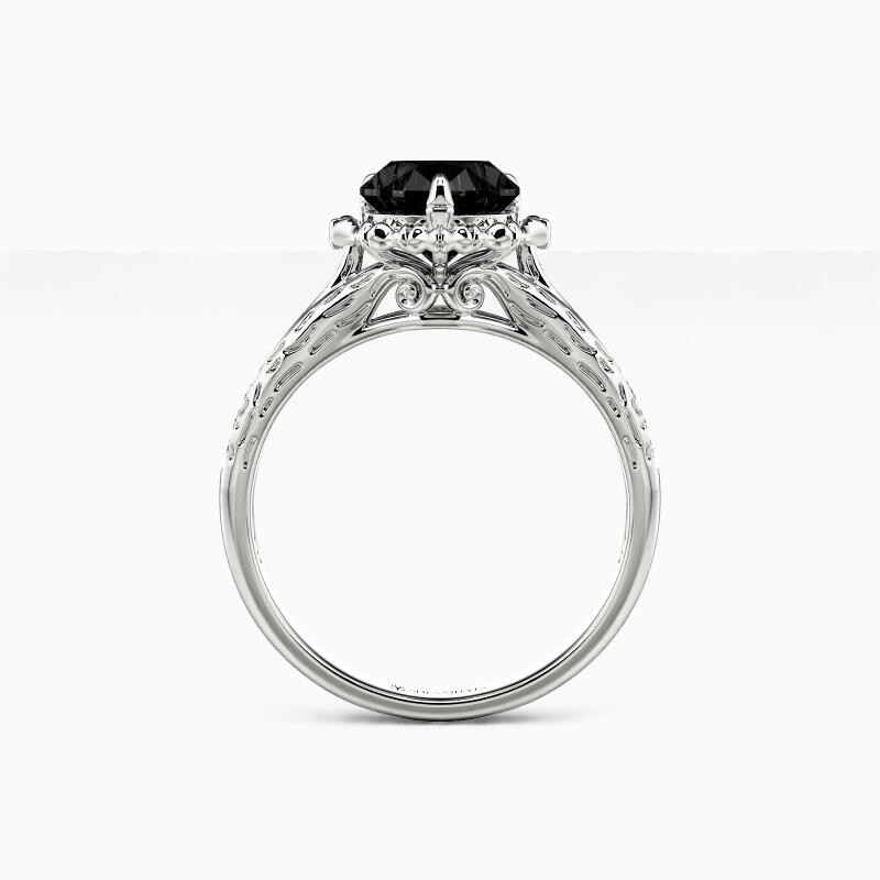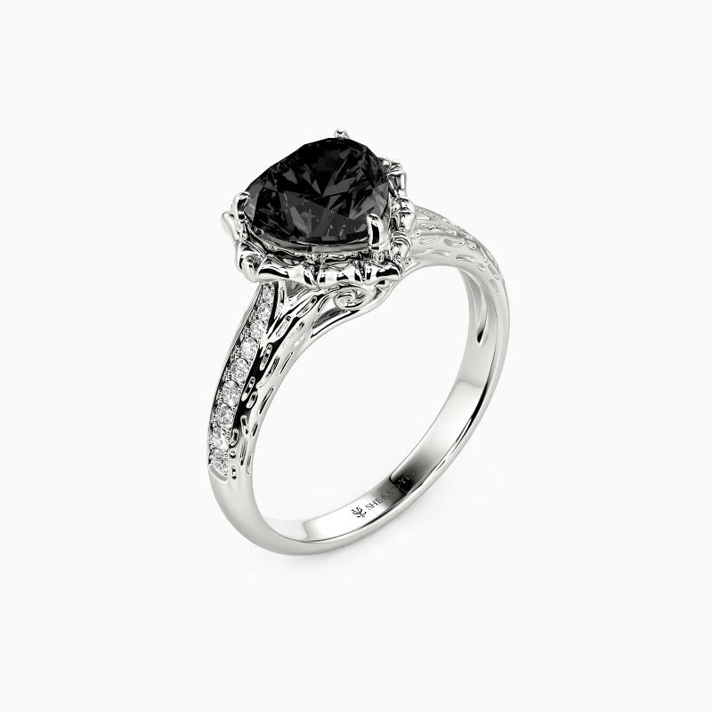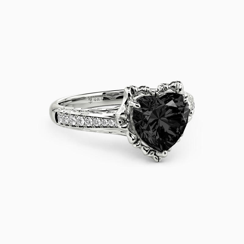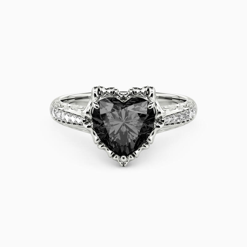 Inspired by Nightmare Before Christmas, our striking engagement ring depicts a classic look with a minimalist design. A sparkling heart-shaped gemstone wrapped in a row of bones on the shank of a brilliantly paved setting. Decorated with delicate scrolls on the gallery, this piece will perfectly fit all your beautiful attires.