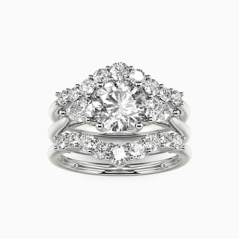 Infused with a modern flair, this wedding set offers an elegant style for any bride. The brilliant round gemstone is flanked by two sparkling pear cut accent gems,  while polished shank added an art deco touch. The matching contoured wedding bands are lined with petite gems that sit flush against the engagement ring for a perfect fit. Say 'I do' to this exquisite bridal set, and lead a happy life from this moment.