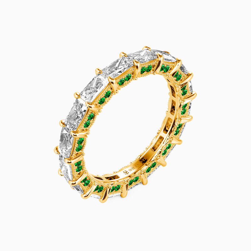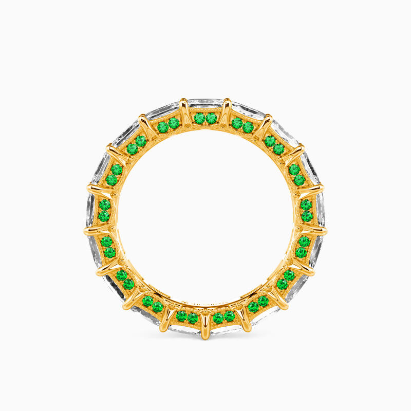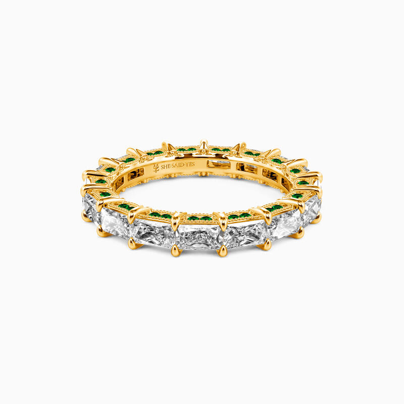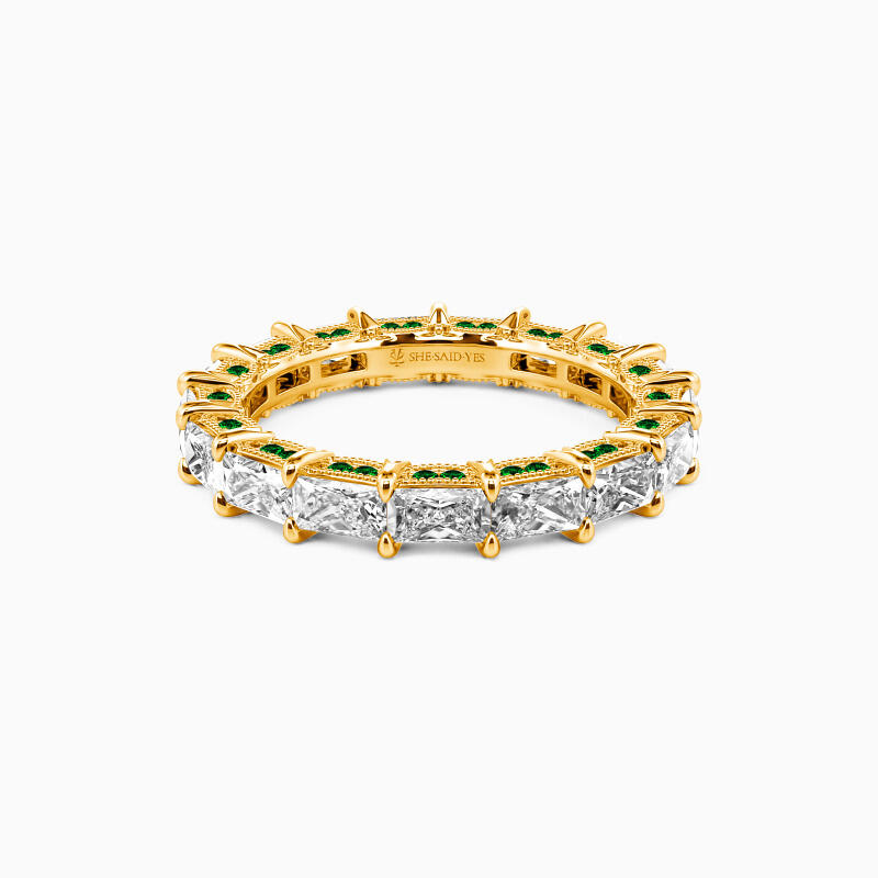 Celebrate your everlasting love story with this eternity band. It features a row of emerald-cut stones set in an elegant, horizontal fashion. And two rows of round-cut stones shimmer on the edges of the band, adding extra brilliance to the appearance. You took everything I was and made me what I am, and I worship you with all.
