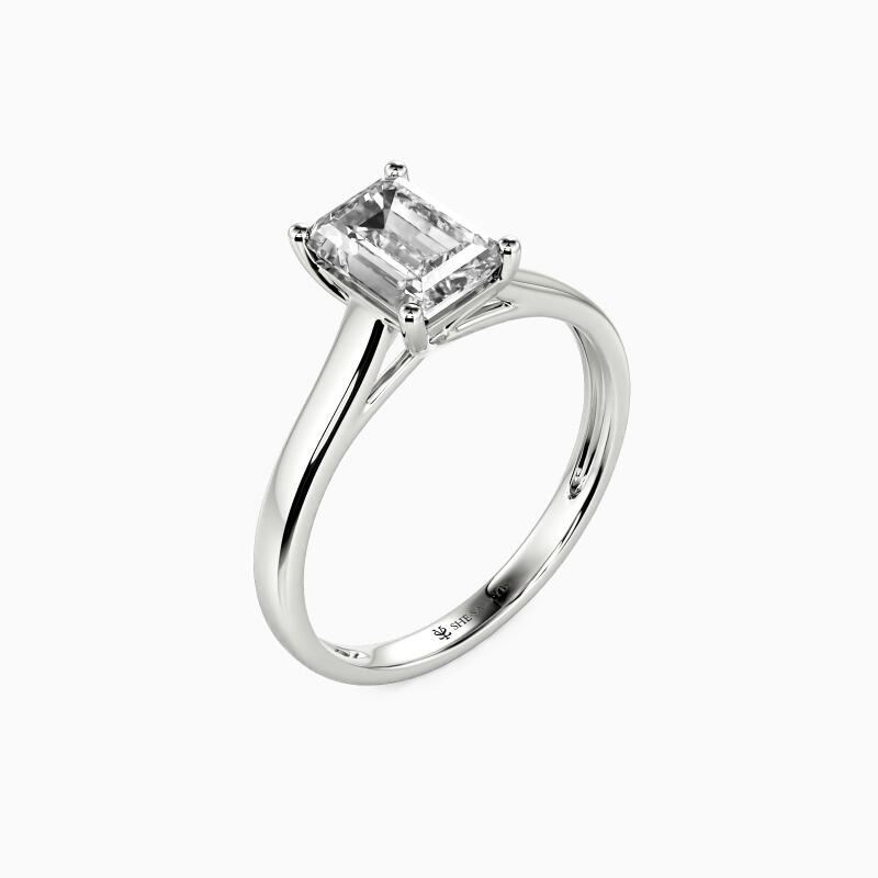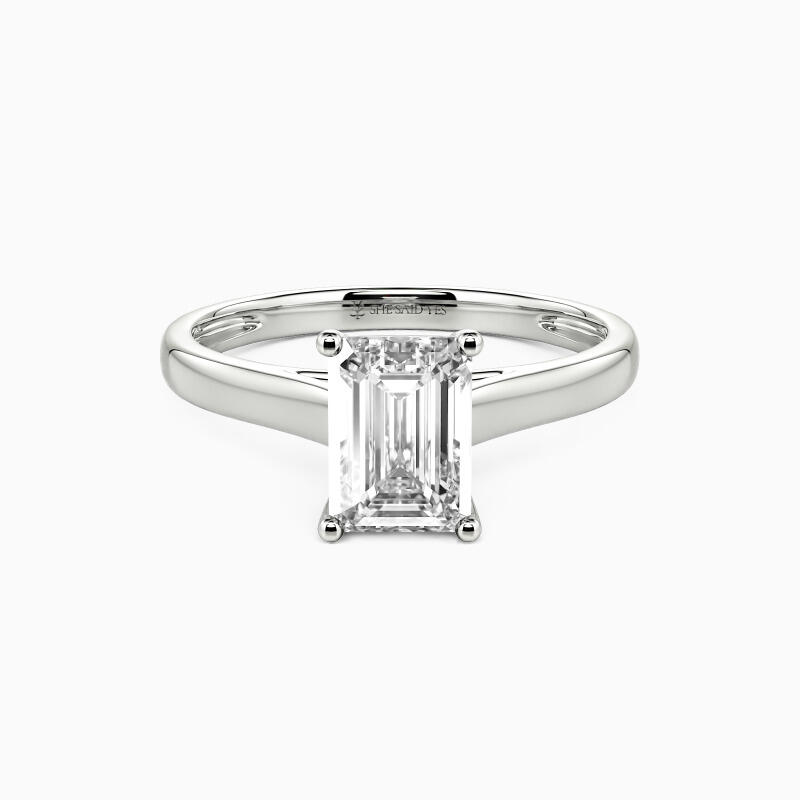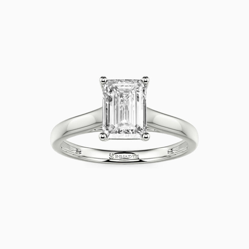 Simple yet divine, ask for her hand with this delicate solitaire. Standing tall in a traditional four-prong setting, a stylish Emerald-cut center stone radiates exceptional sparkle. An amazing look for the woman you adore, this engagement ring is finished with a shining polished shine.