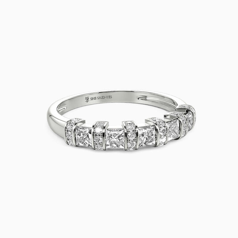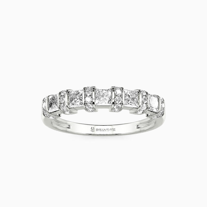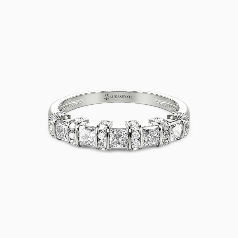 This wedding ring features five sparkling princess-cut stones set in a channel setting and tiny round-cut accents set in a pavé setting. They create a fantastic combination and evoke a sense of timeless elegance. It can stack with your engagement ring or be worn alone to offer you an exemplary appeal.