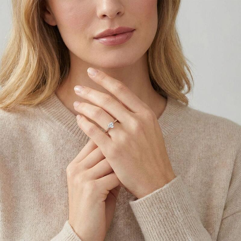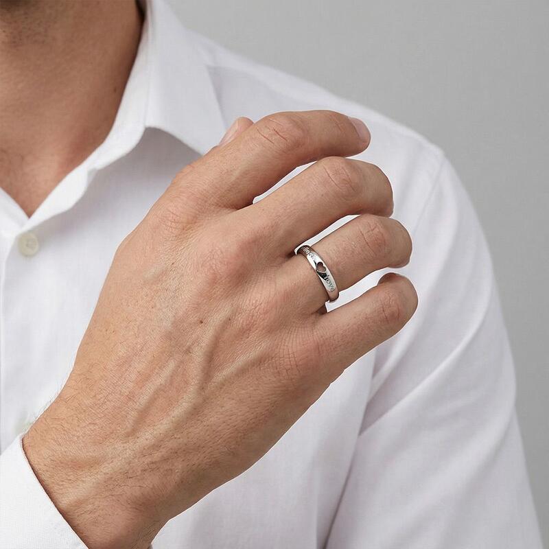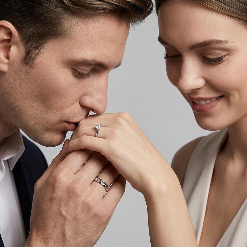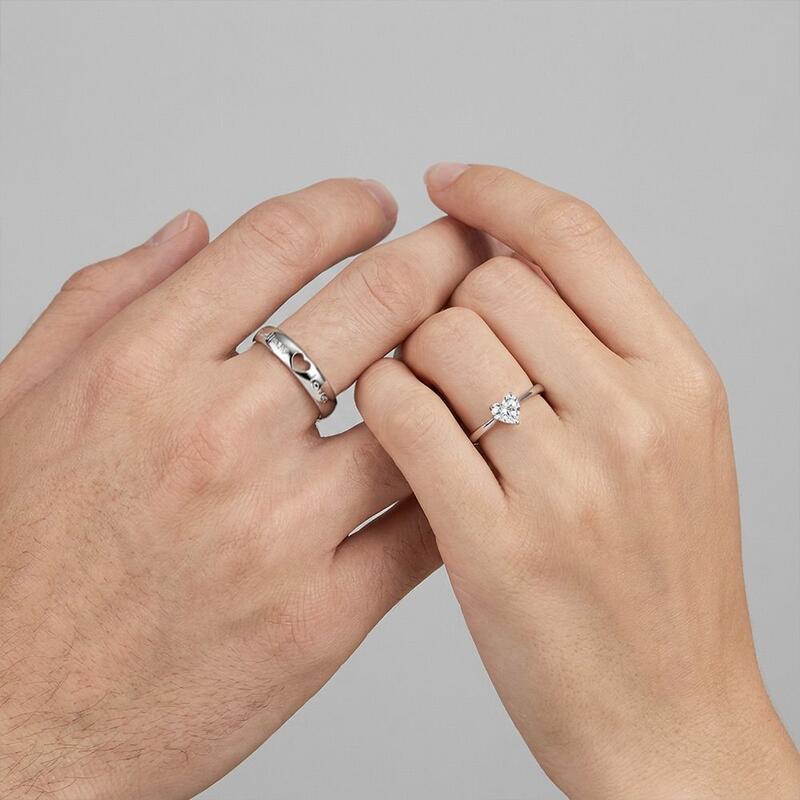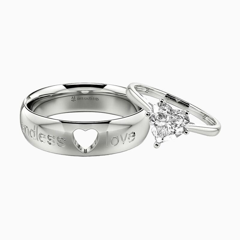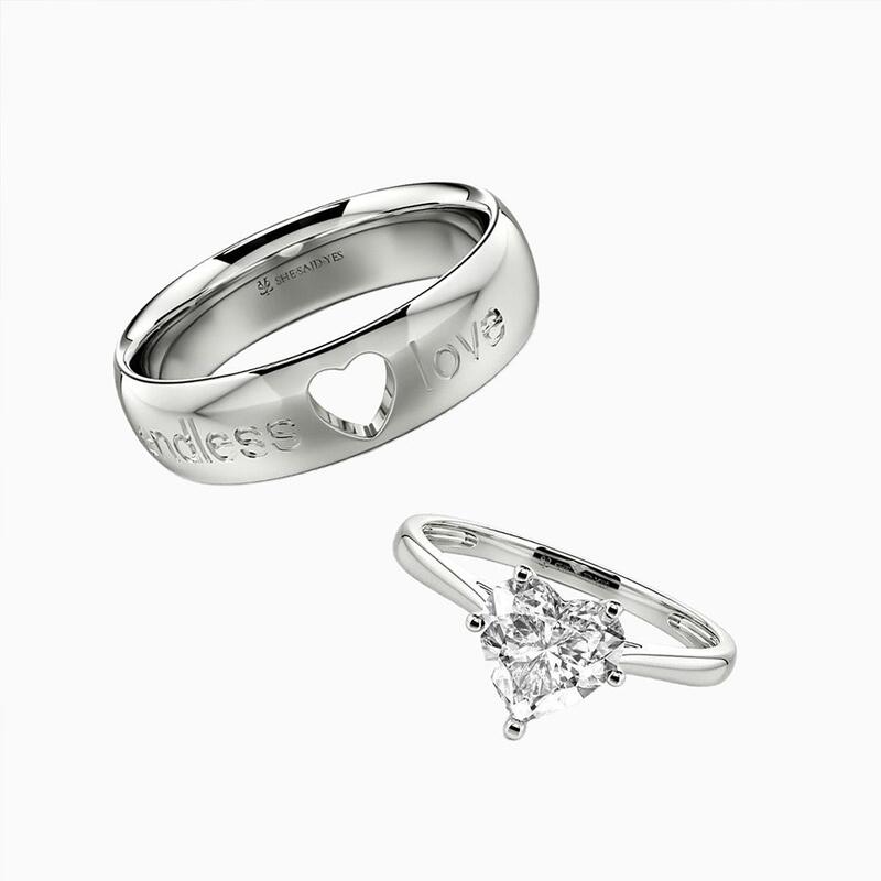 These couples' rings weave distinct elegance into a unified love story. The feminine piece showcases a luminous heart-cut solitaire, its tapered shank narrowing gracefully to spotlight the central motif. The masculine band boasts a smooth dome silhouette with a high-polish finish, etched with "endless love" and a delicate hollow heart—mirroring the female ring's shape to bind their styles in romantic harmony.