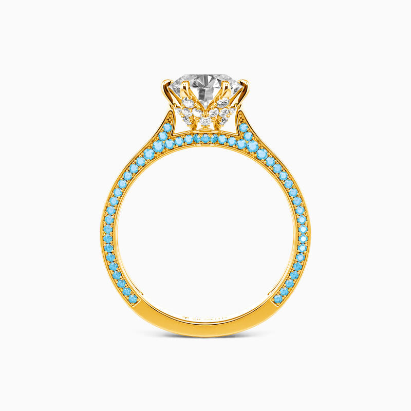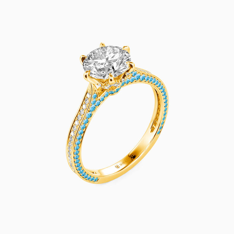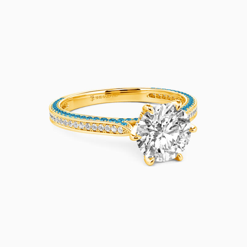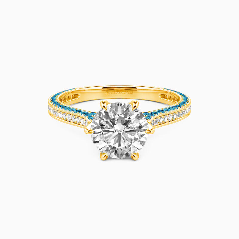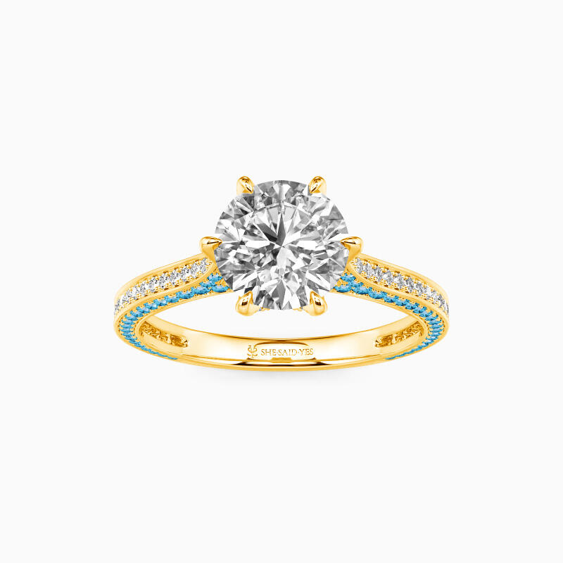 Revealing indefinite brilliance with a twinkling round center stone embraced in six prongs, a fine collection of pavéd accents embedded on either side of the shank permits the simplistic but timeless charm for the whole ring. Ever since I met you, you are my queen, and I know I will fight for you forever.