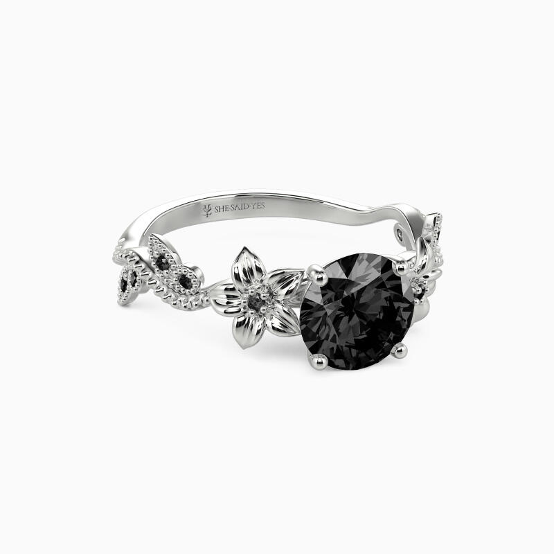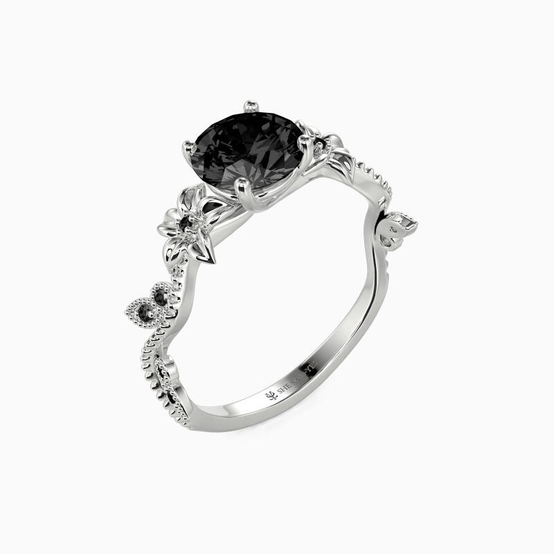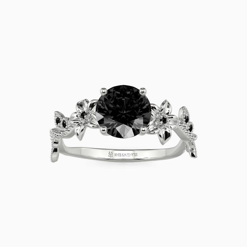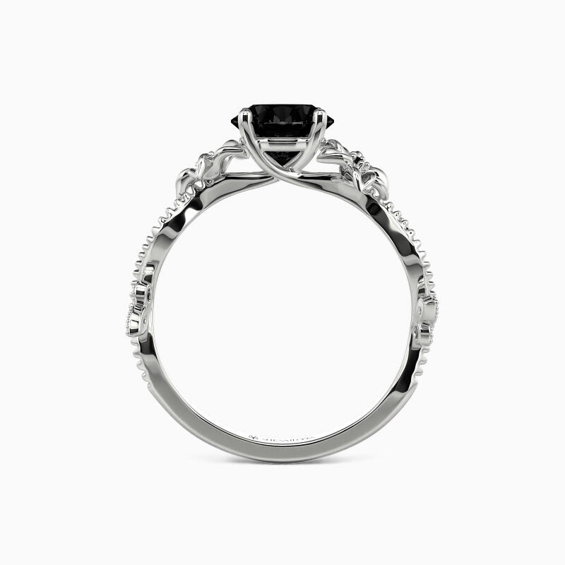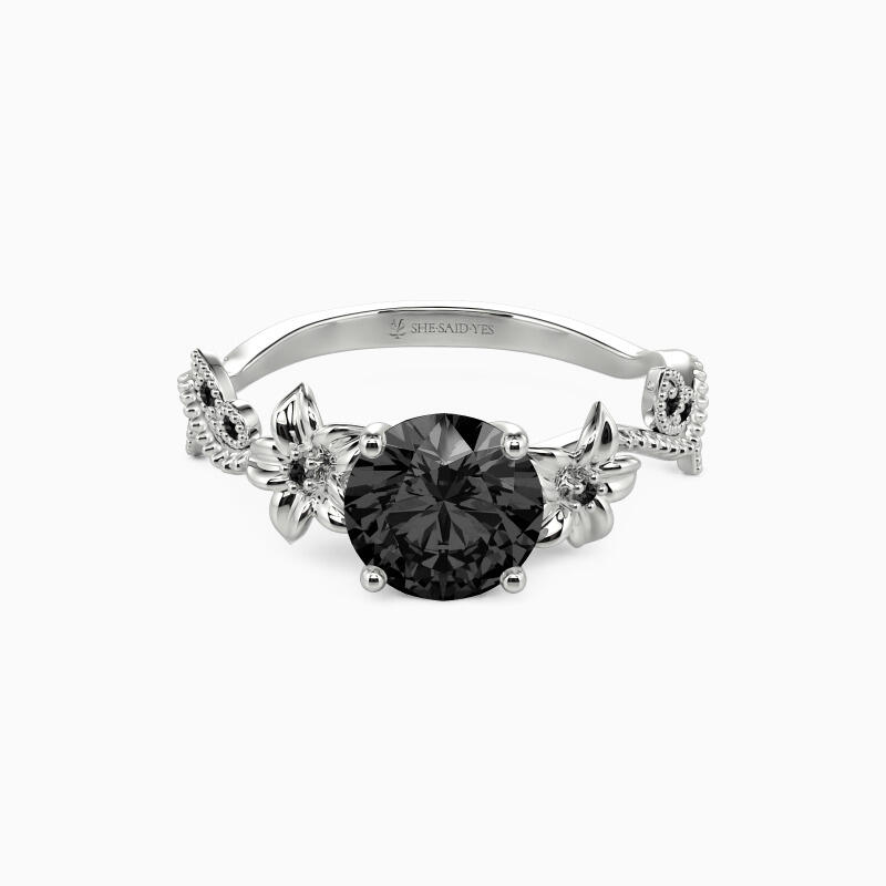 A charming round-cut center stone is surrounded by the floral and leaves pattern studded on the cathedral shank completing this magnificent side stone engagement ring. And tiny glistening accents with milgrain details enhance the overall look for a dash of splendor. You are my sunshine, and you make me happy when skies are gray.
