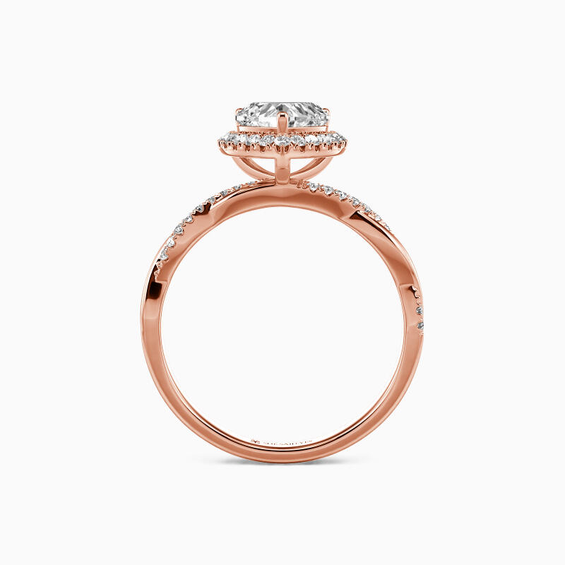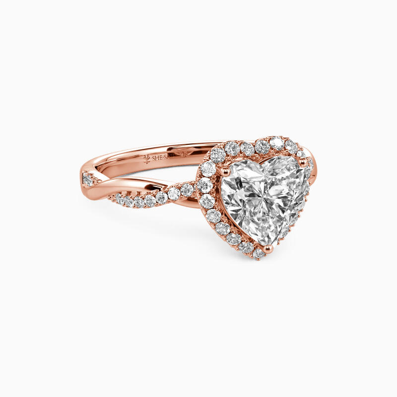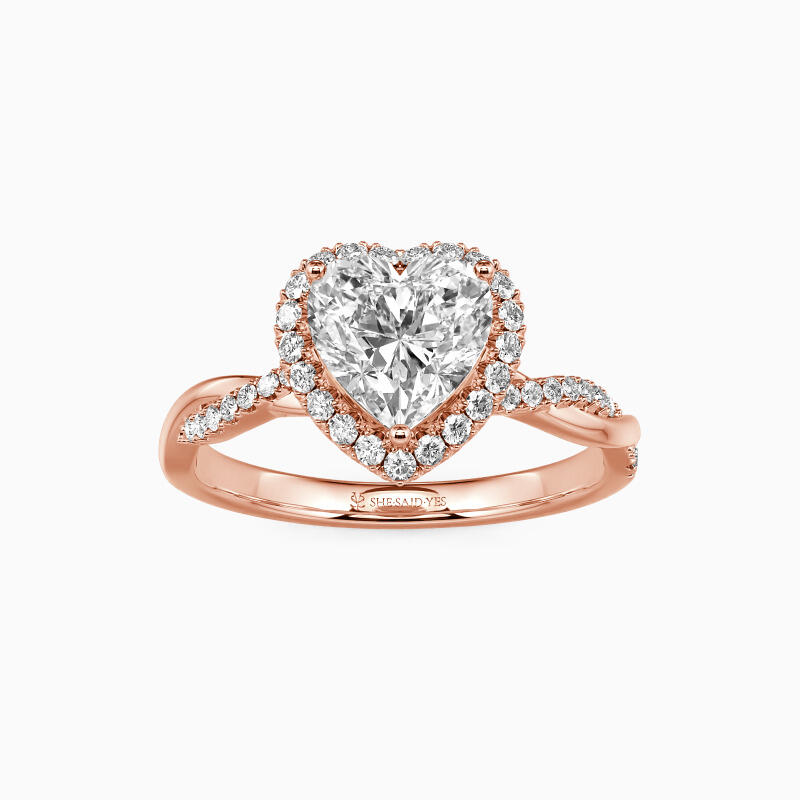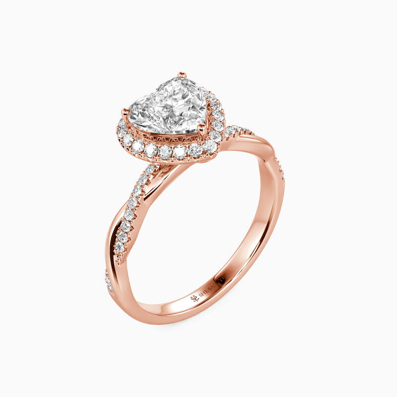 This breathtaking engagement ring features a heart-cut center stone held by a radiant halo that shimmers brilliantly in the light, evoking the warmth and tenderness of your everlasting bond. The gracefully twisted shank adds a touch of modern elegance to the ring's classic design. This exquisite ring is a perfect gift that is certain to be treasured, signifying your unwavering love for your beloved.