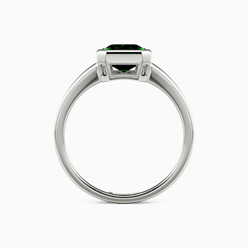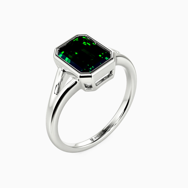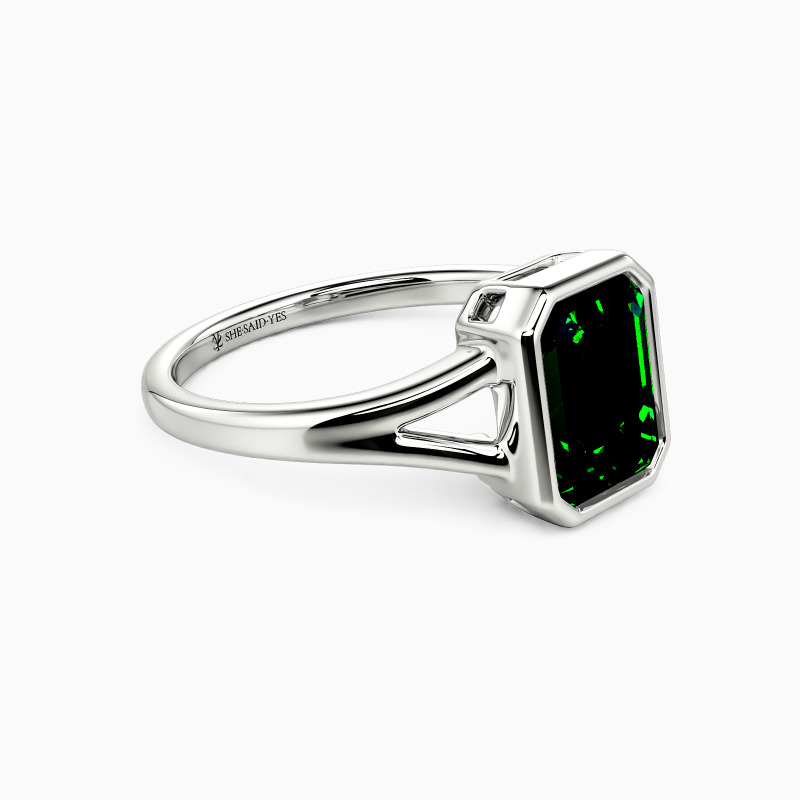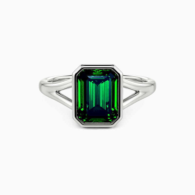With architectural elegance, this solitaire ring makes a profound statement. Its emerald-cut center stone, secured in a sleek bezel, emanates a hall-of-mirrors glow. The gracefully split shank cradles the stone, symbolizing two paths uniting as one. A modern testament to a love that is clear, strong, and brilliantly focused forever.