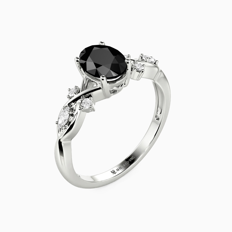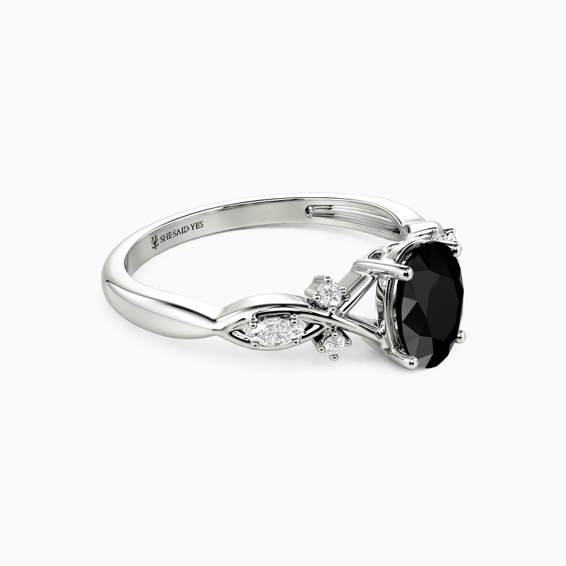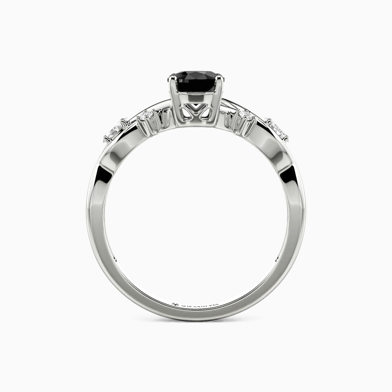 A graceful oval center stone takes the spotlight, flanked by delicate marquise and round side stones that trace the band like scattered stardust. The infinity-twisted shank adds a whisper of symbolism—its intertwined arcs mirroring a love without end. Understated yet meaningful, this ring balances elegance with quiet intention.