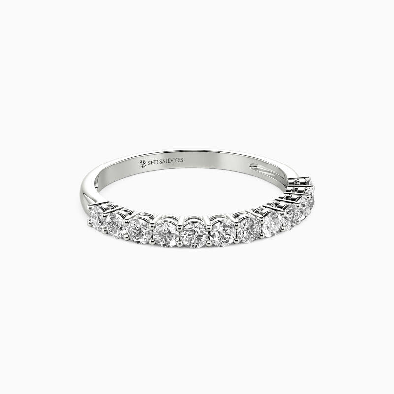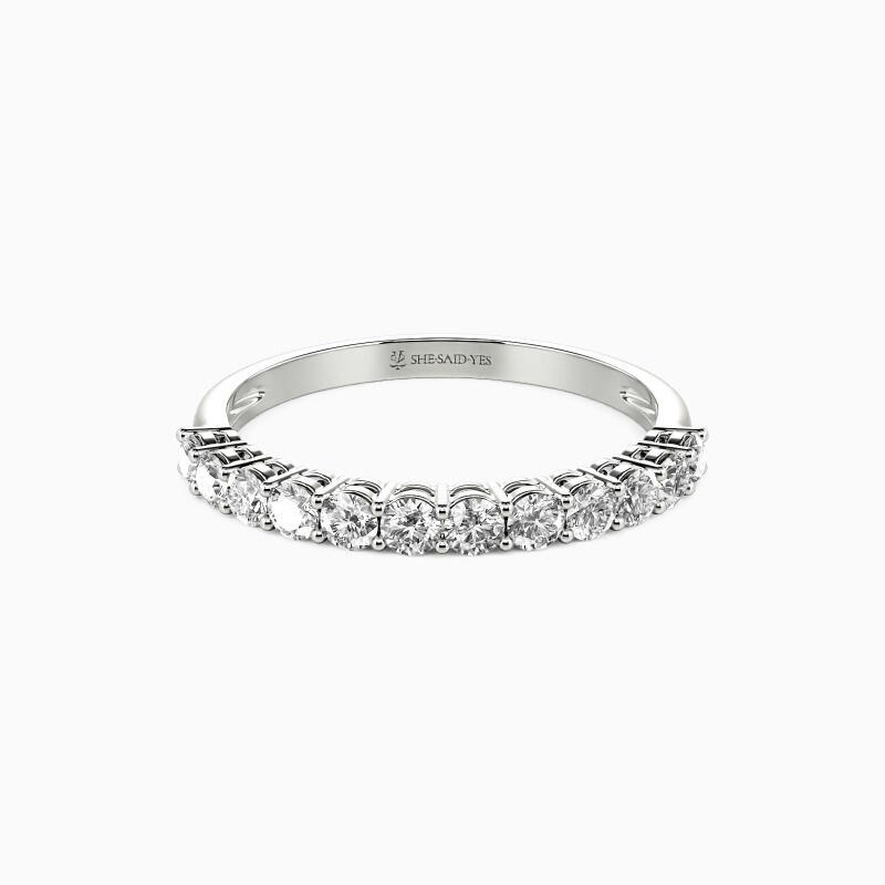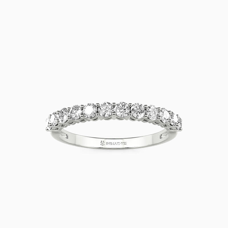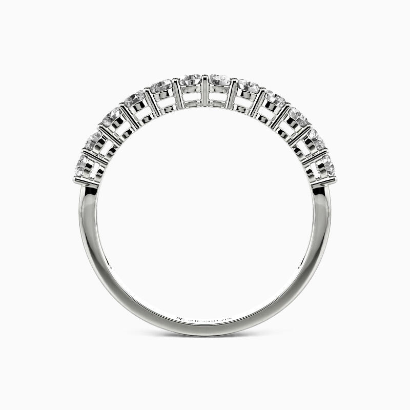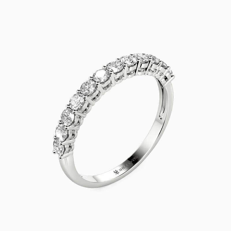 Beautifully studded in a shared prong setting is twelve shimmering stones in a row, sparkling halfway along the shank. And the other half lustrous shank permits the whole ring to radiate more lights from all angles. Wearing it alone is enough to unveil your appeal with this classic and timeless design.