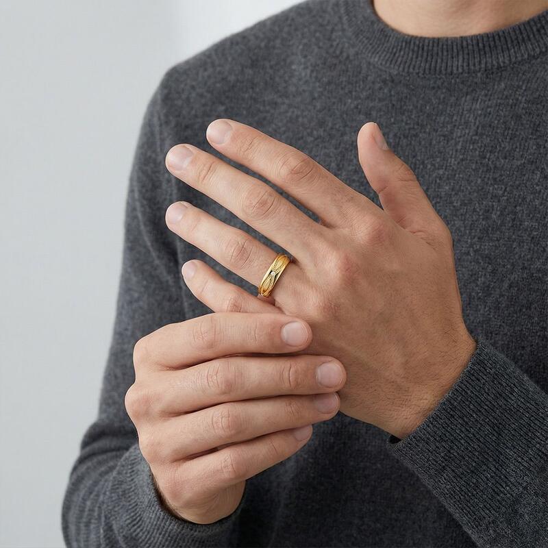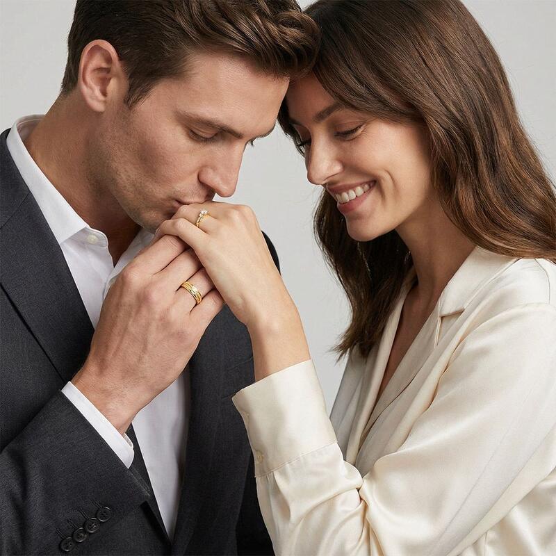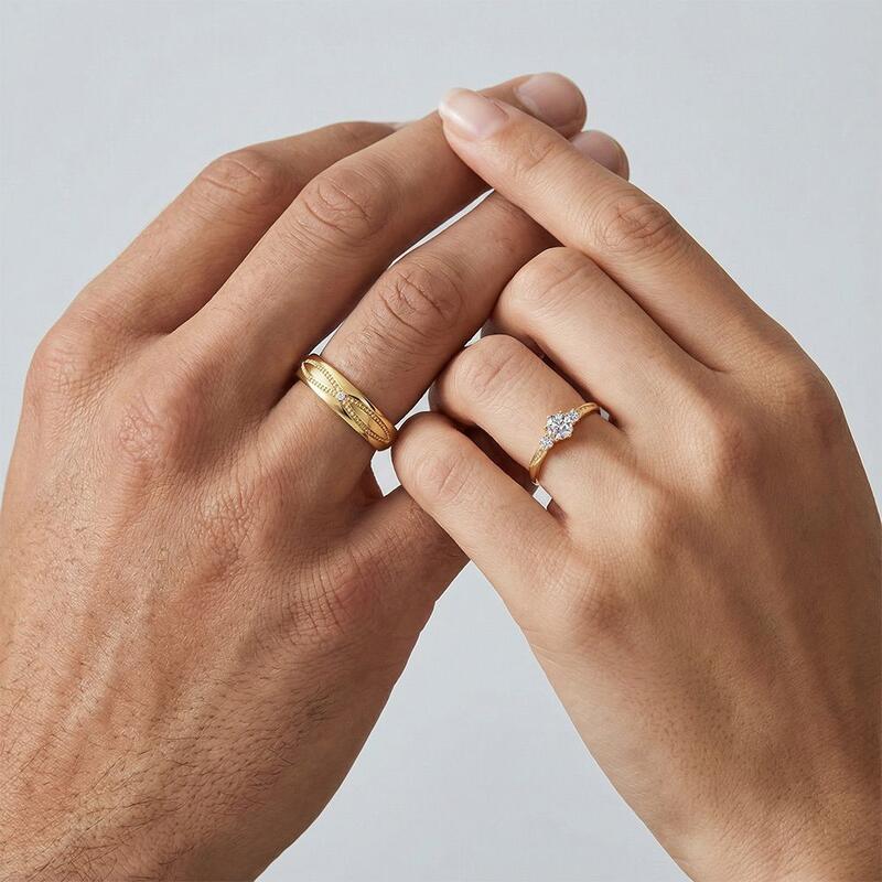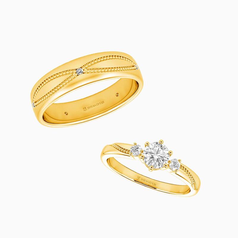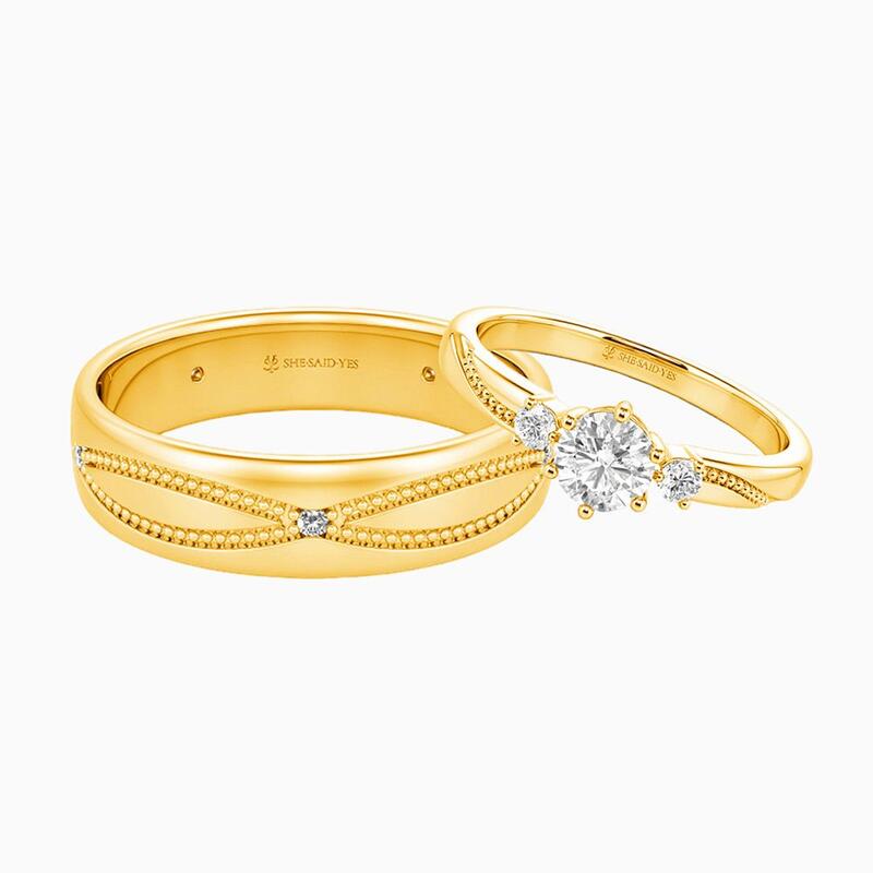 Intertwining past and present, this couple's set tells a unique love story. Her ring's trio of brilliant stones, embraced by delicate milgrain detailing, whispers of cherished memories and future promises. His polished band, adorned with a gem-studded twisted milgrain motif, echoes her design while asserting its own character. Together, they form a harmonious duet of classic romance and contemporary style.