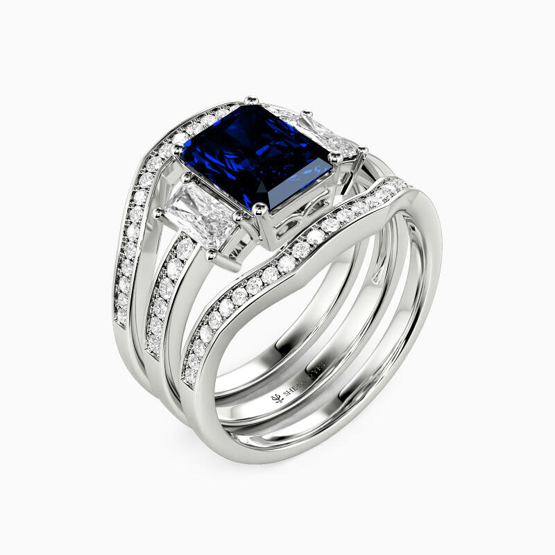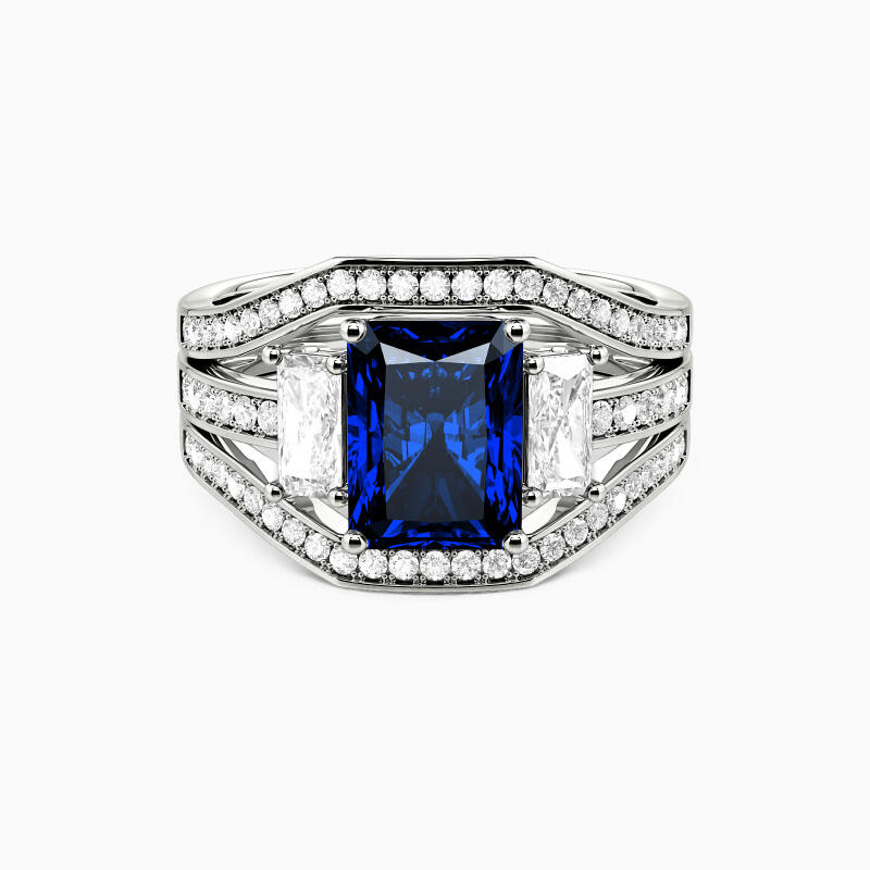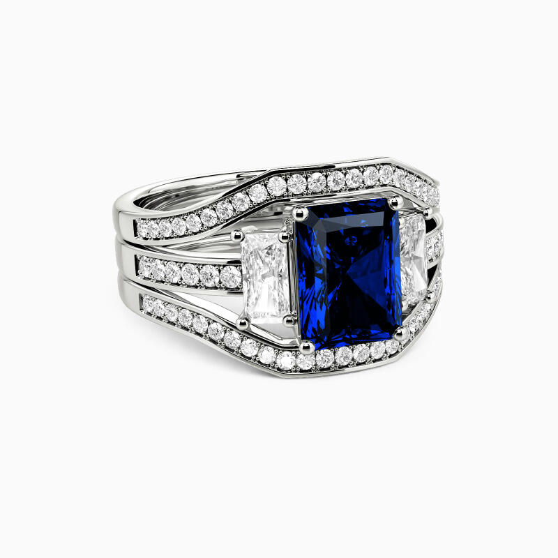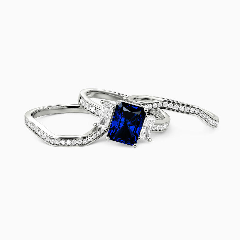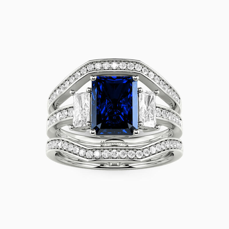 This exquisite bridal set embodies timeless elegance and romance. The stunning engagement ring showcases a radiant-cut center stone flanked by two smaller radiant-cut gems, creating a dazzling trio. The bright-cut paved shank adds extra sparkle, while two curved matching wedding bands complete this harmonious ensemble, symbolizing your eternal love and commitment.