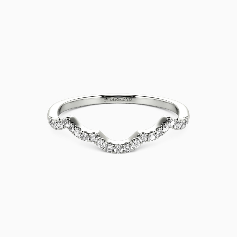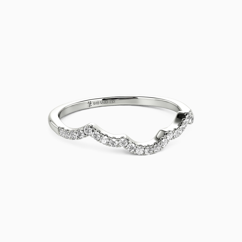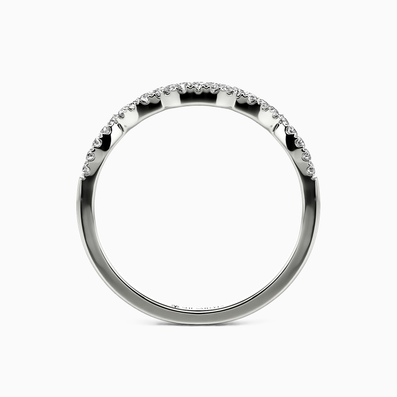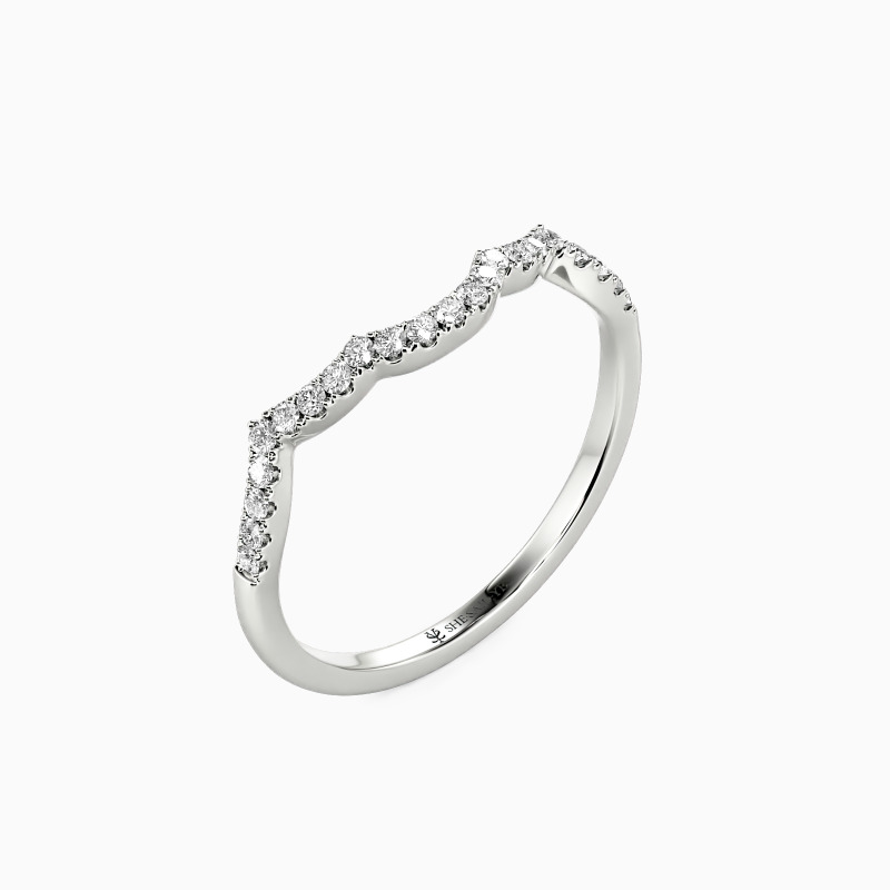 This classic wedding band dazzles you with a row of sparkling round accents in a pavé setting. Further enhancing the overall look is a delicately curved shank. This design allows it to stack with your engagement ring. Or you can wear it alone in daily life to show understated appeal.