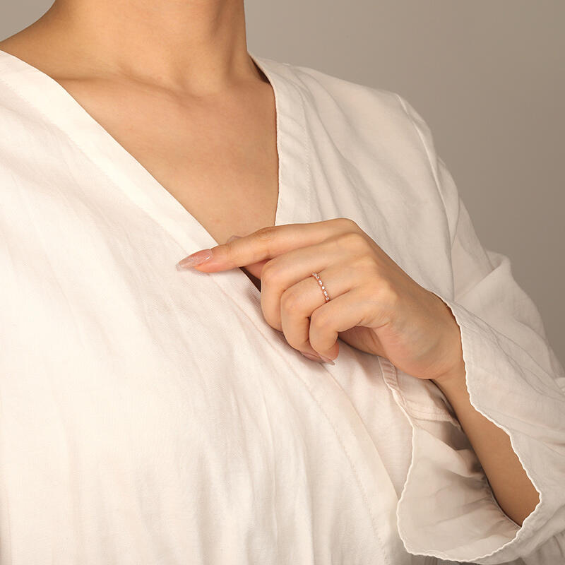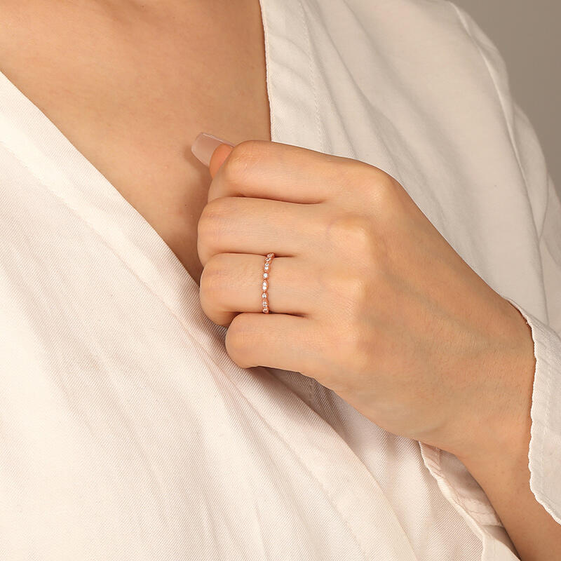 Small glittering round cut stones arranged in a marvelous prong and bezel setting cover half the delicate shank. And the milgrain embellishment adds extra charm and beauty. You can wear this wedding band alone or stack it with a halo engagement to memorize your forever love.